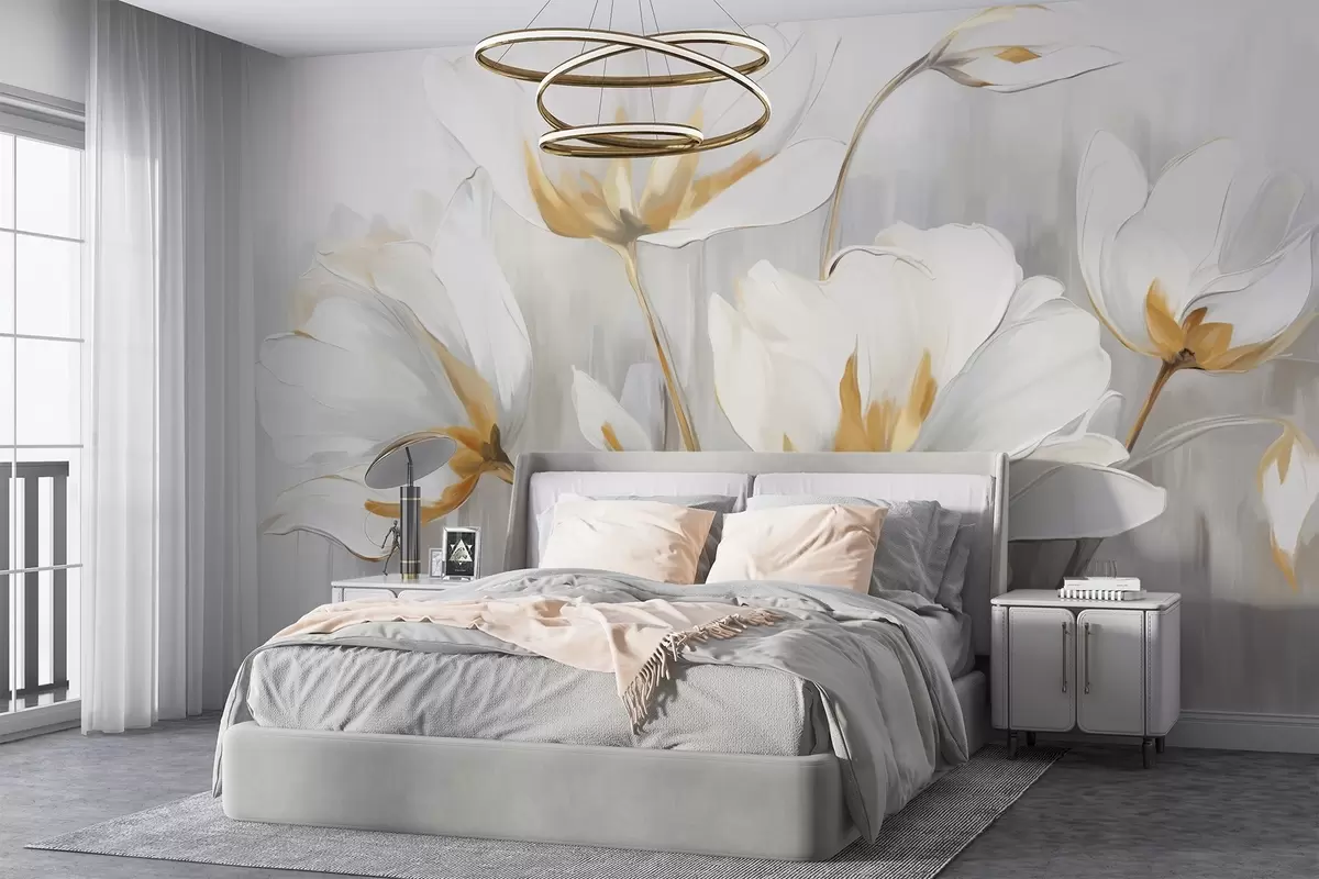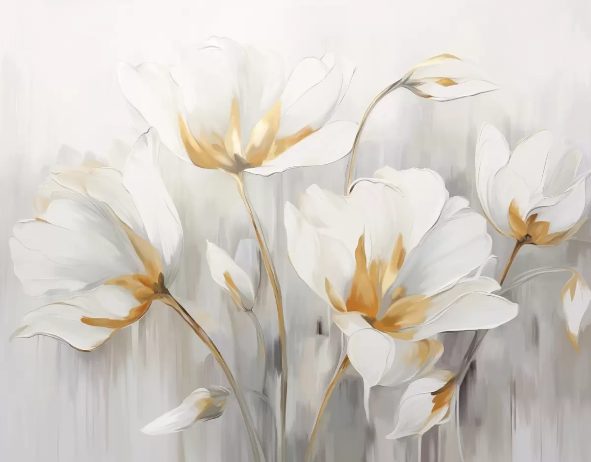 Fototapet Flori abstracte albe cu petale și tulpini albe pe un fundal gri cu tușe verticale gri și albe Nr. w09047