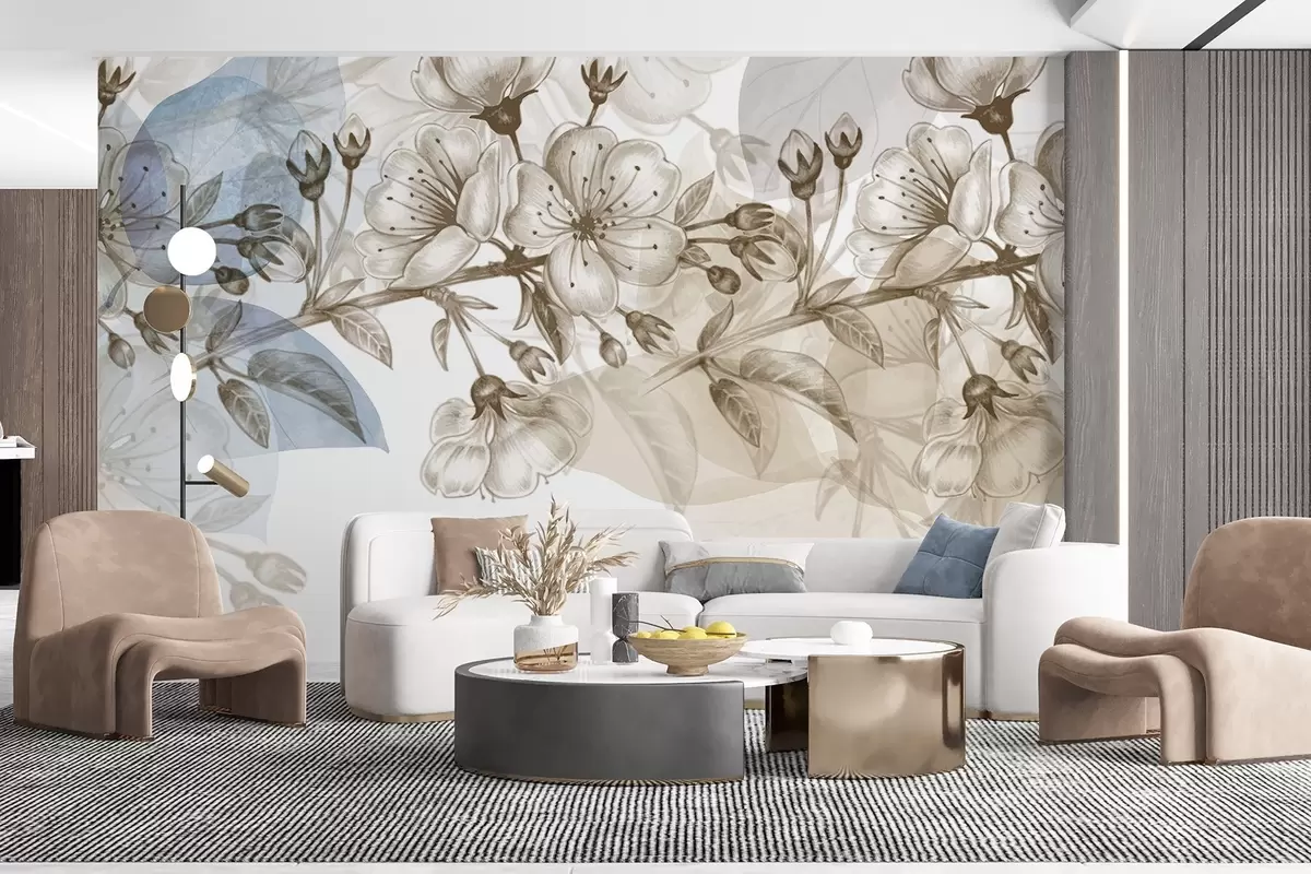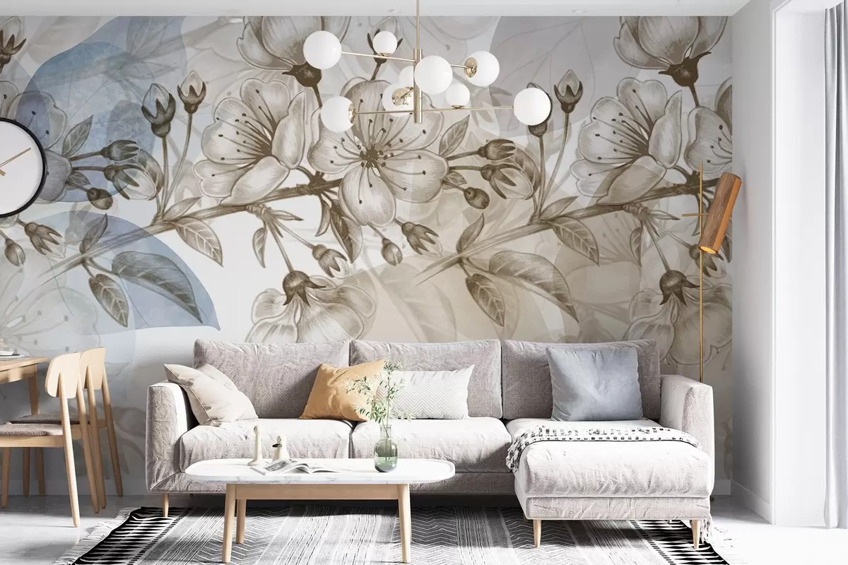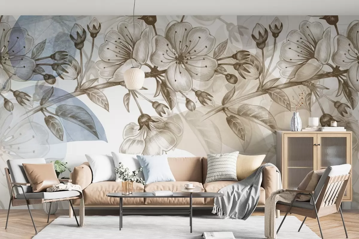 Fototapet Ramură de floare de cireș cu flori și muguri, tonuri sepia, fundal moale ca de acuarelă cu nuanțe de albastru și maro Nr. w09051