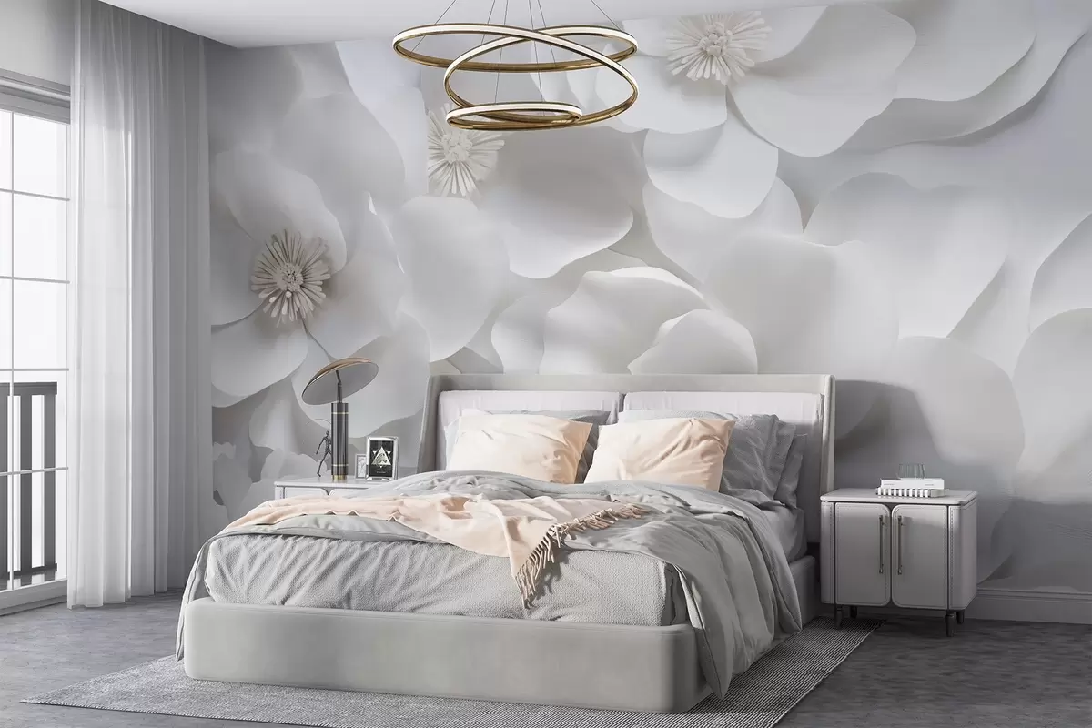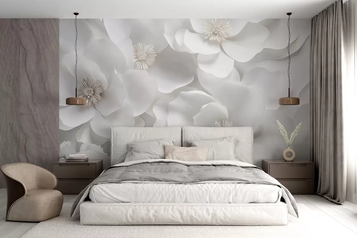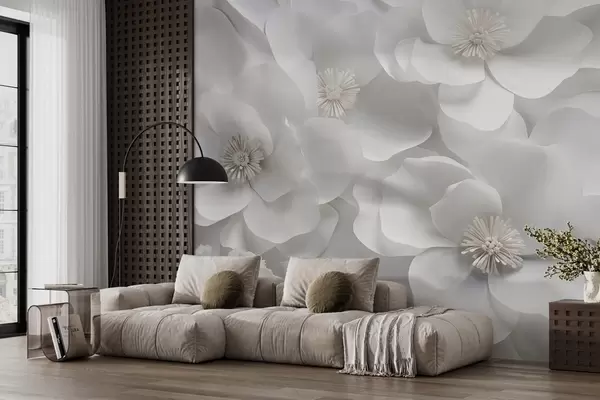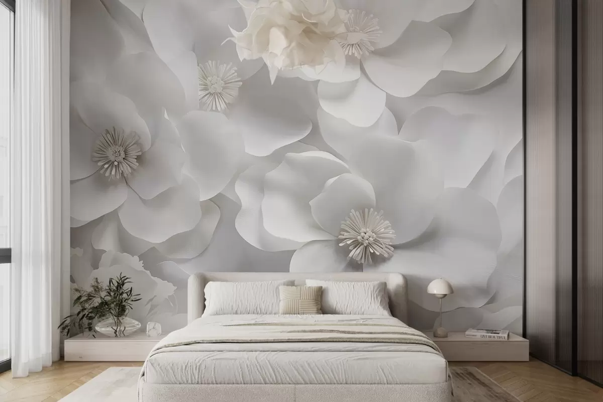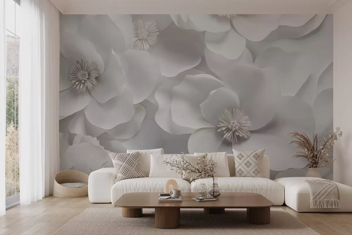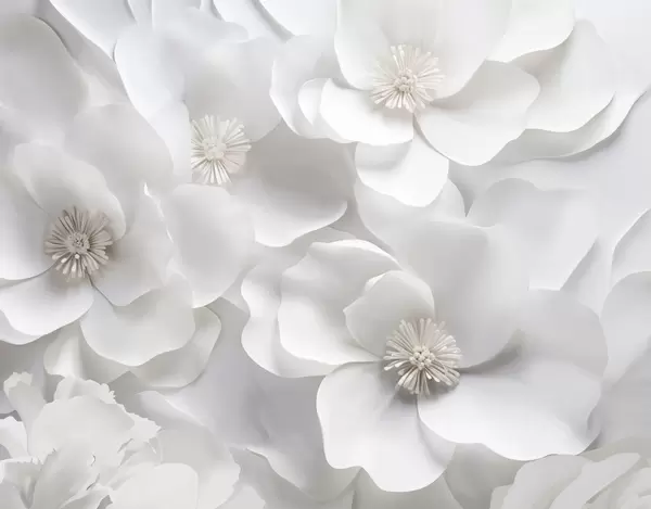 Fototapet Flori albe cu petale delicate, aranjate într-un buchet dens, creând un sentiment de puritate și eleganță pe fundal alb Nr. w09053