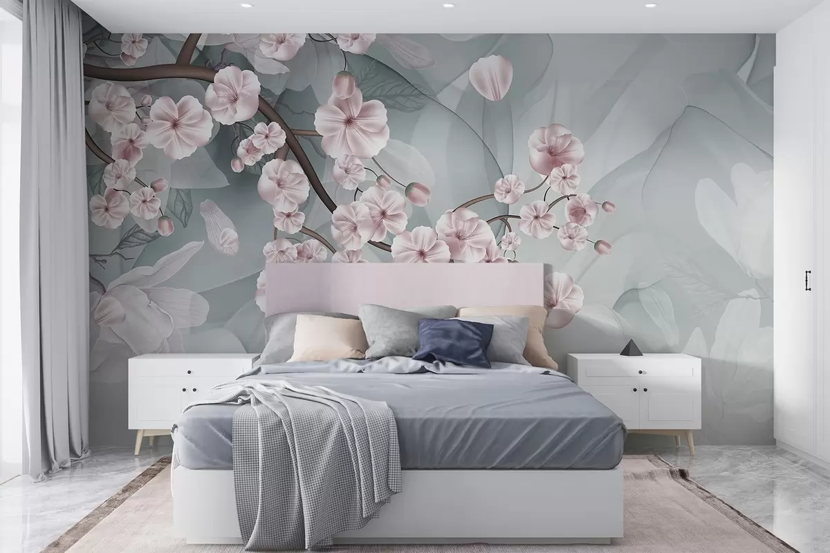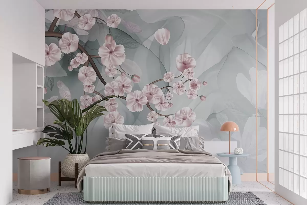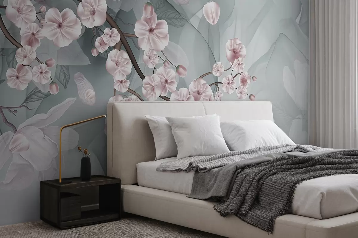 Fototapet Ramuri de flori de cireș cu flori roz și petale, ramuri maro, fundal abstract mut cu efect de curgere Nr. w09054