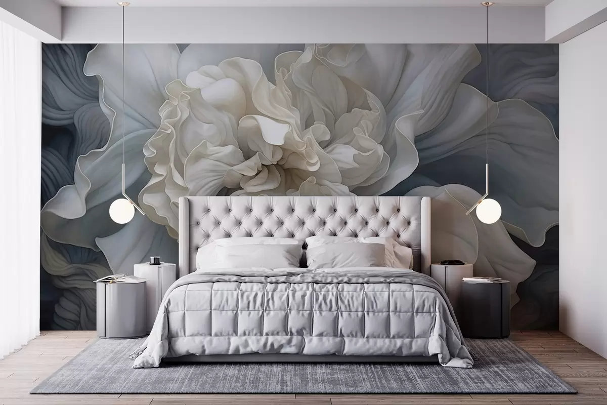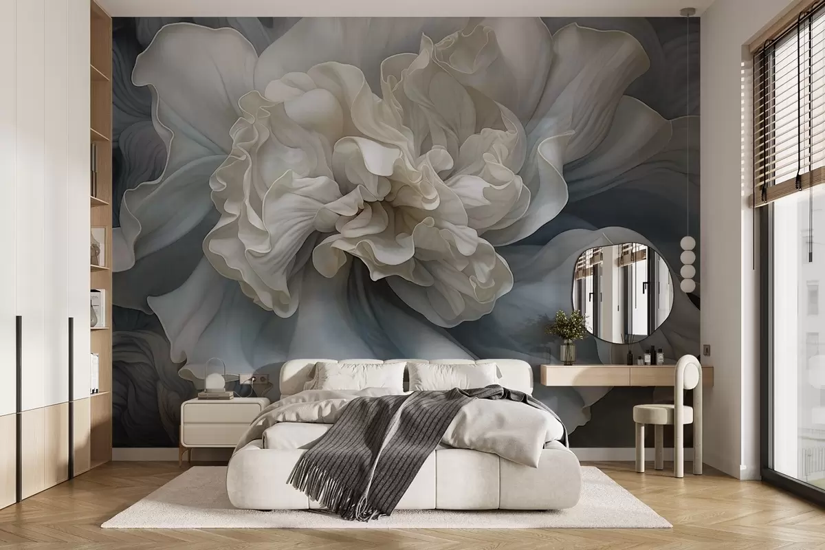 Fototapet Abstract floare decorativă mare cu multe petale, moale și delicată, cu nuanțe de albastru și gri în fundal Nr. w09055