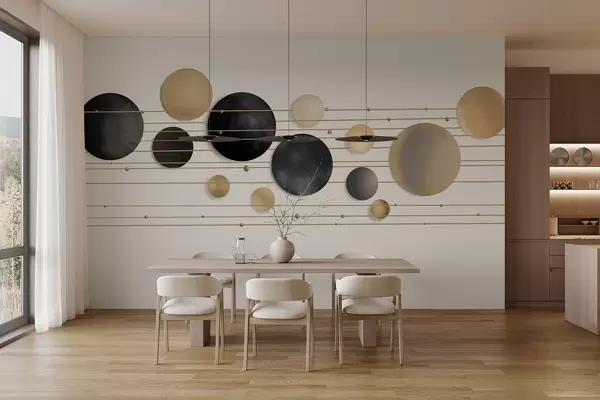 Fototapet Design abstract modern cu cercuri texturate în tonuri de alb, galben și gri, conectate prin linii subțiri, artă minimalistă Nr. w09060