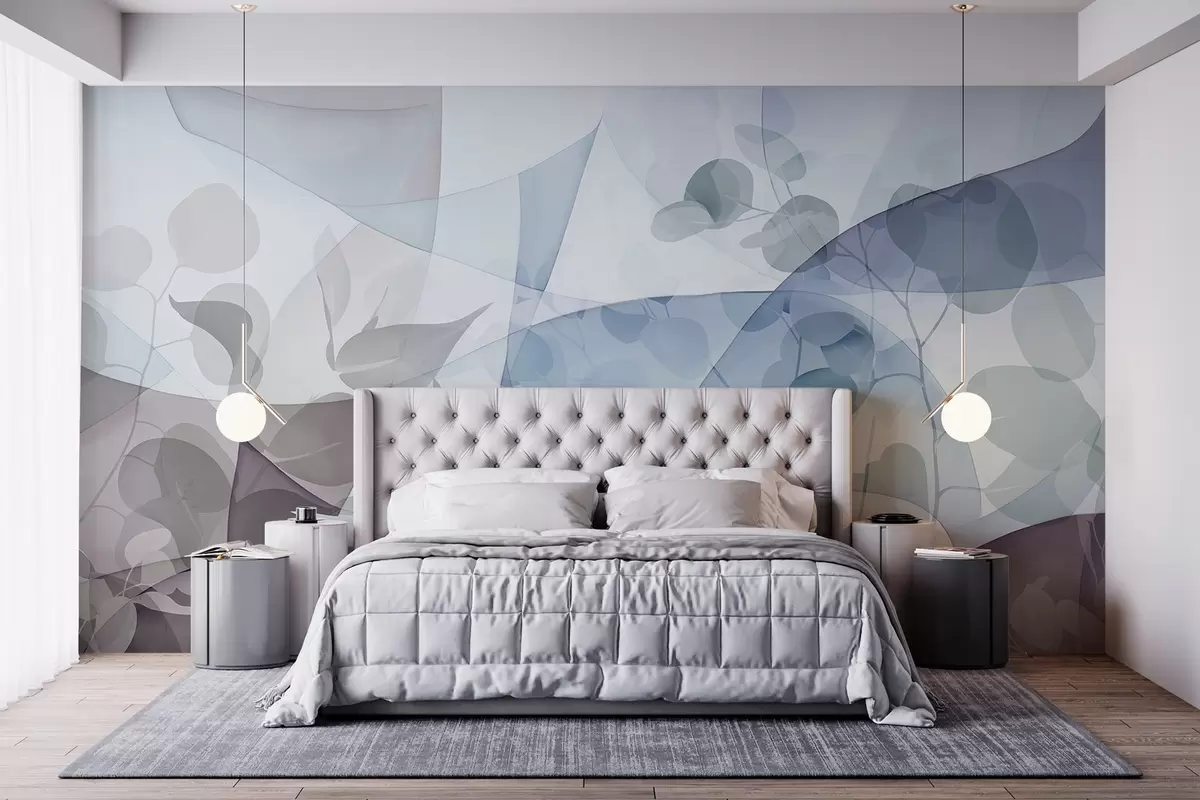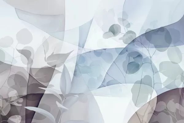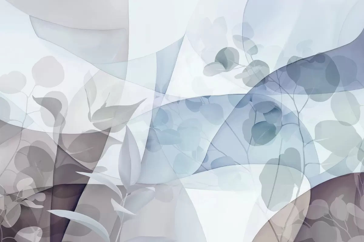 Fototapet Ilustrație botanică abstractă cu frunze de eucalipt și forme geometrice în culori moi de albastru, maro și alb Nr. w09061