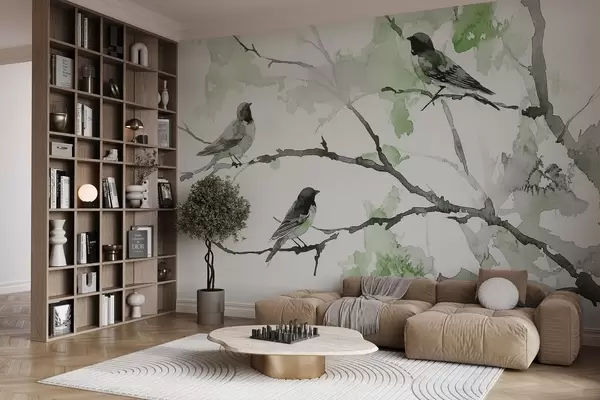 Fototapet Păsări pe ramuri de copac în stil acuarelă Nr. w09064v3