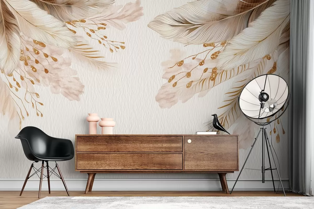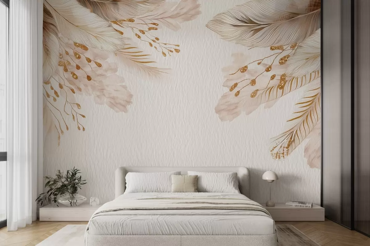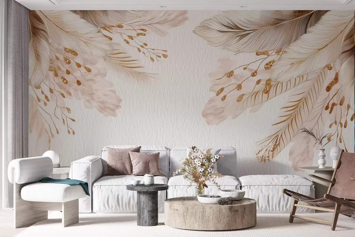 Fototapet Iarbă de pampas și pene în stil acuarelă în bej și alb pe hârtie Nr. w09079