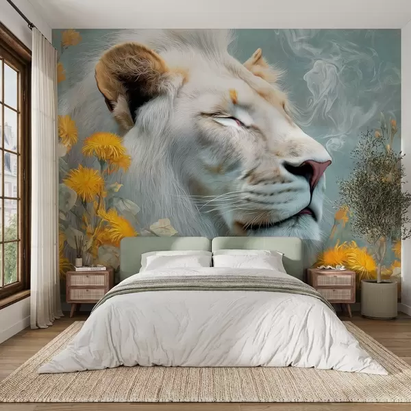 Fototapet Un leu alb înconjurat de flori galbene și fum Nr. w09080