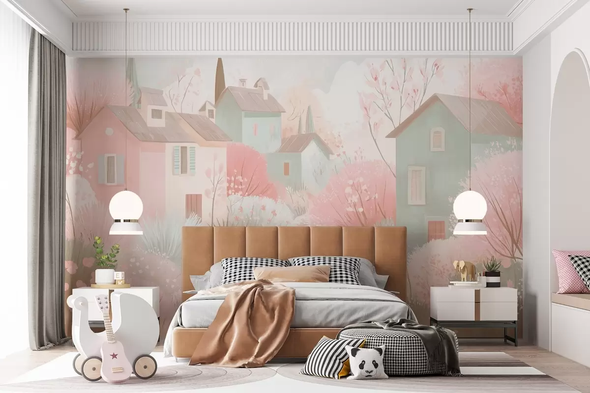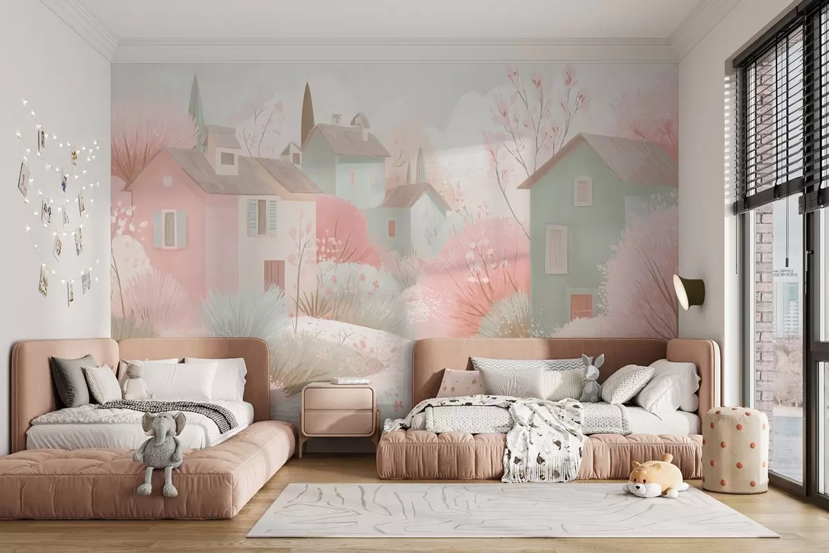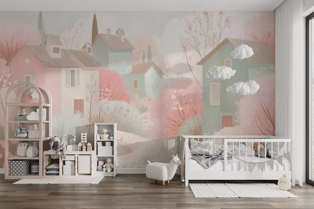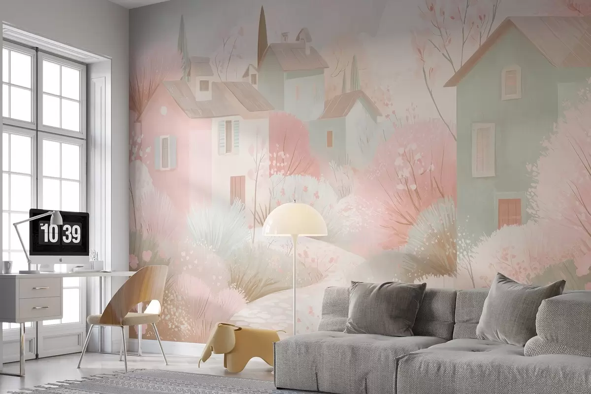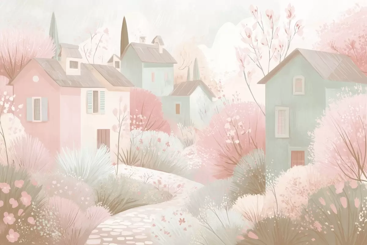 Fototapet Oraș de basm în stil pictură în ulei în nuanțe de roz Nr. w09095