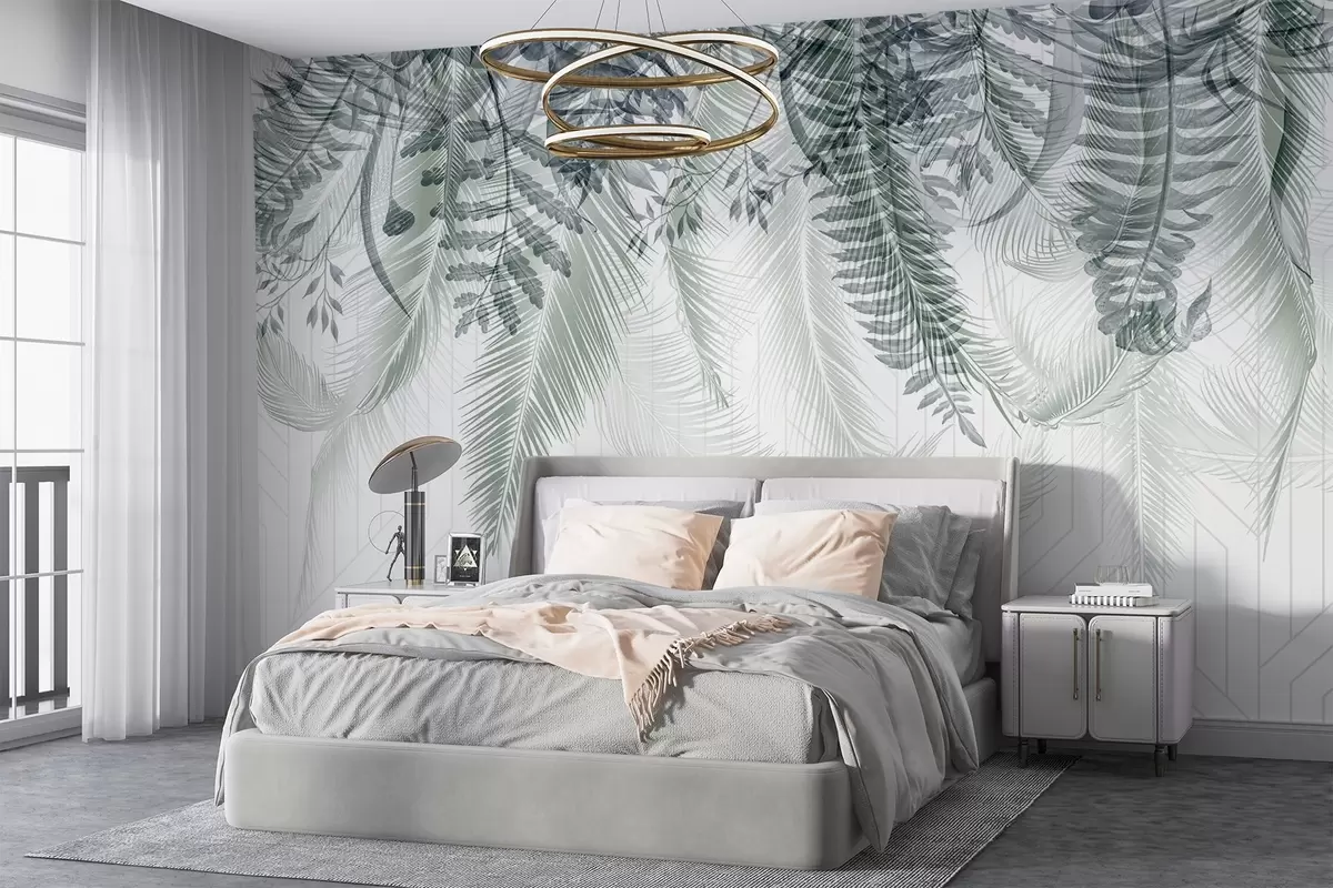 Fototapet Delicate care se încadrează ferigă tropicală și frunze de palmier, fundal geometric, lumină moale, culori mute, elegant Nr. w09106