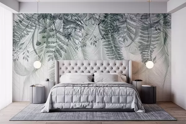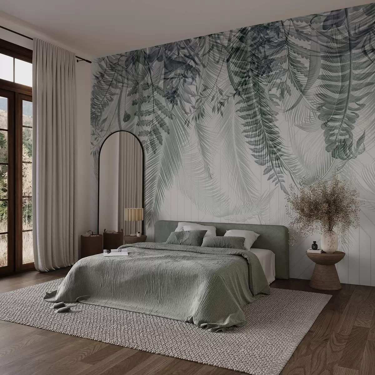 Fototapet Delicate care se încadrează ferigă tropicală și frunze de palmier, fundal geometric, lumină moale, culori mute, elegant Nr. w09106