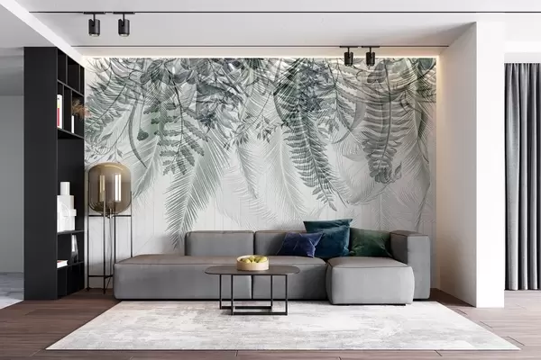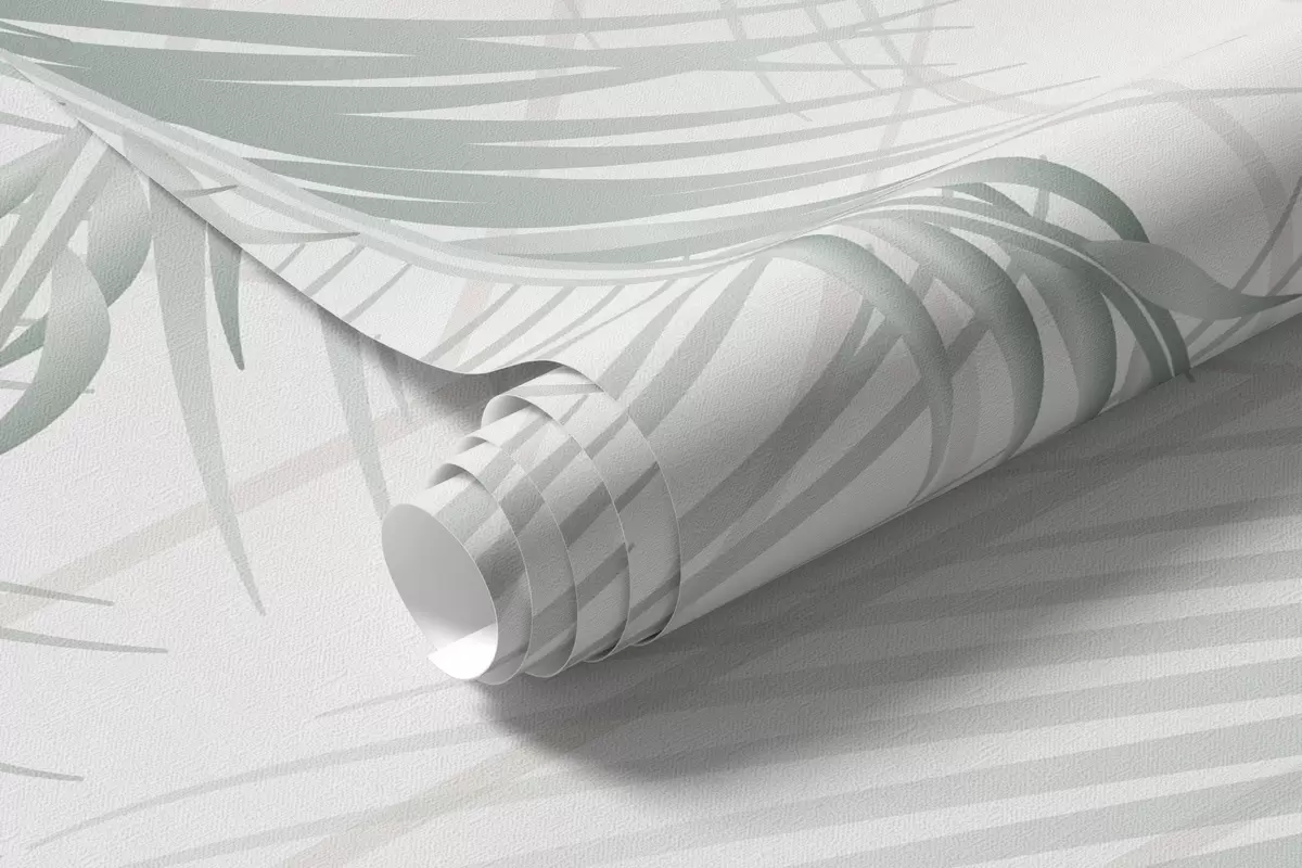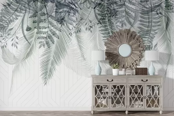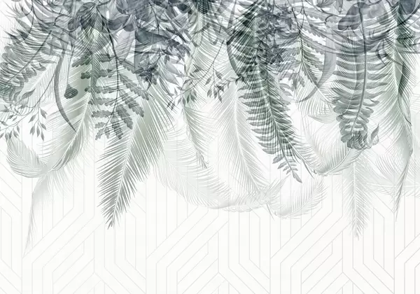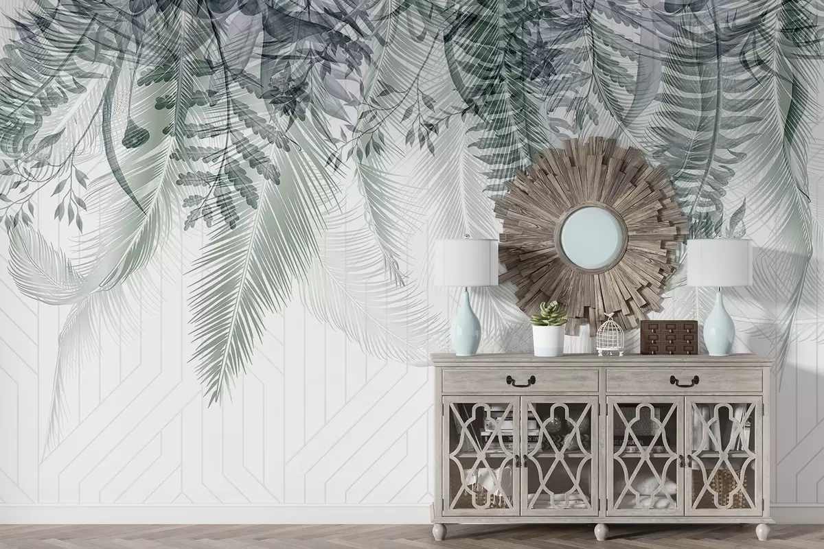 Fototapet Delicate care se încadrează ferigă tropicală și frunze de palmier, fundal geometric, lumină moale, culori mute, elegant Nr. w09106