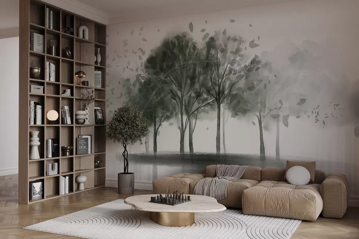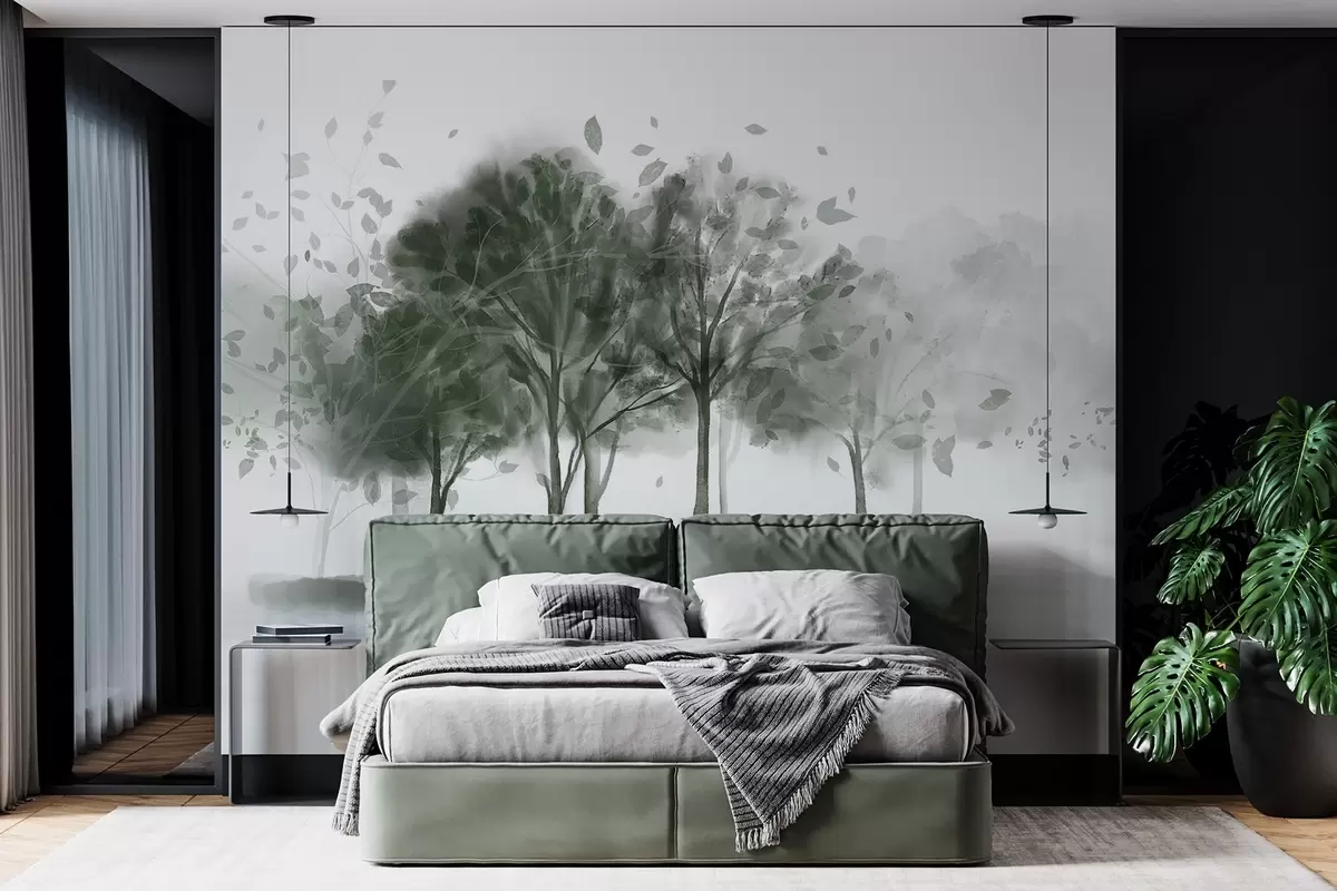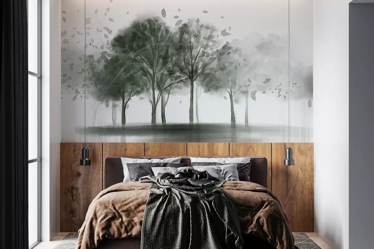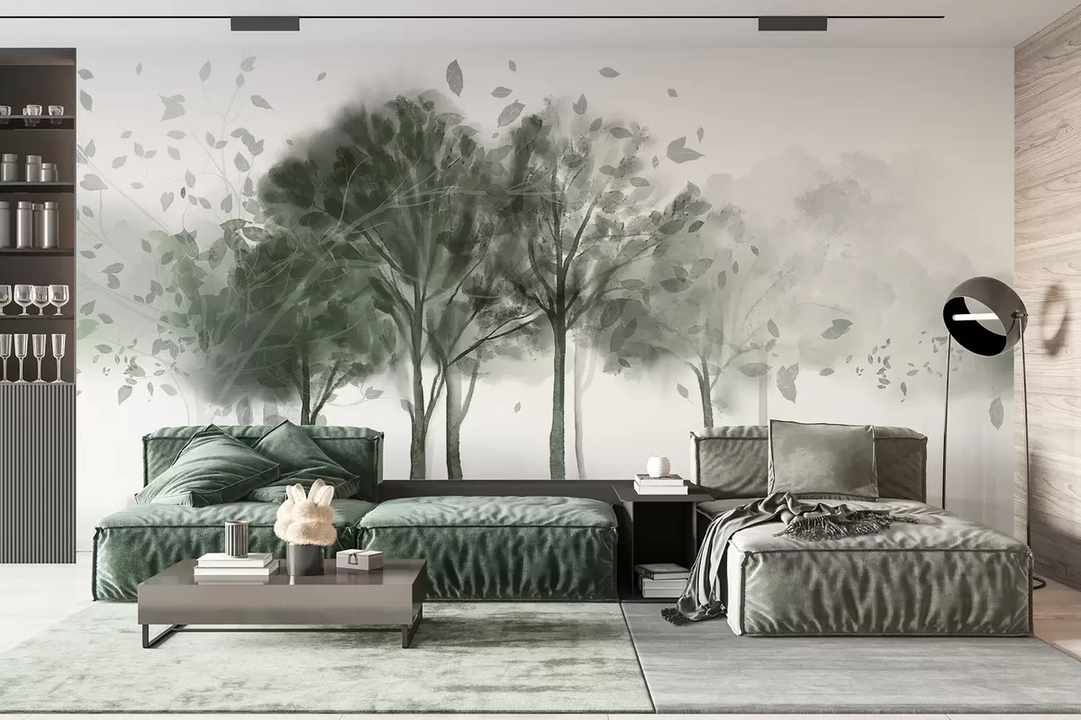 Fototapet Peisaj abstract cu copaci cu frunze verzi care se reflectă în apă, în acuarelă stil texturat Nr. w09109