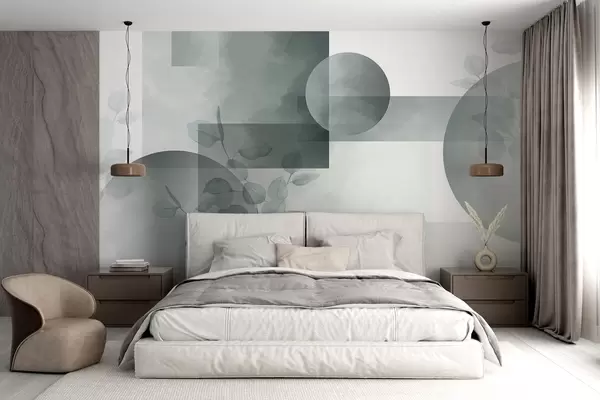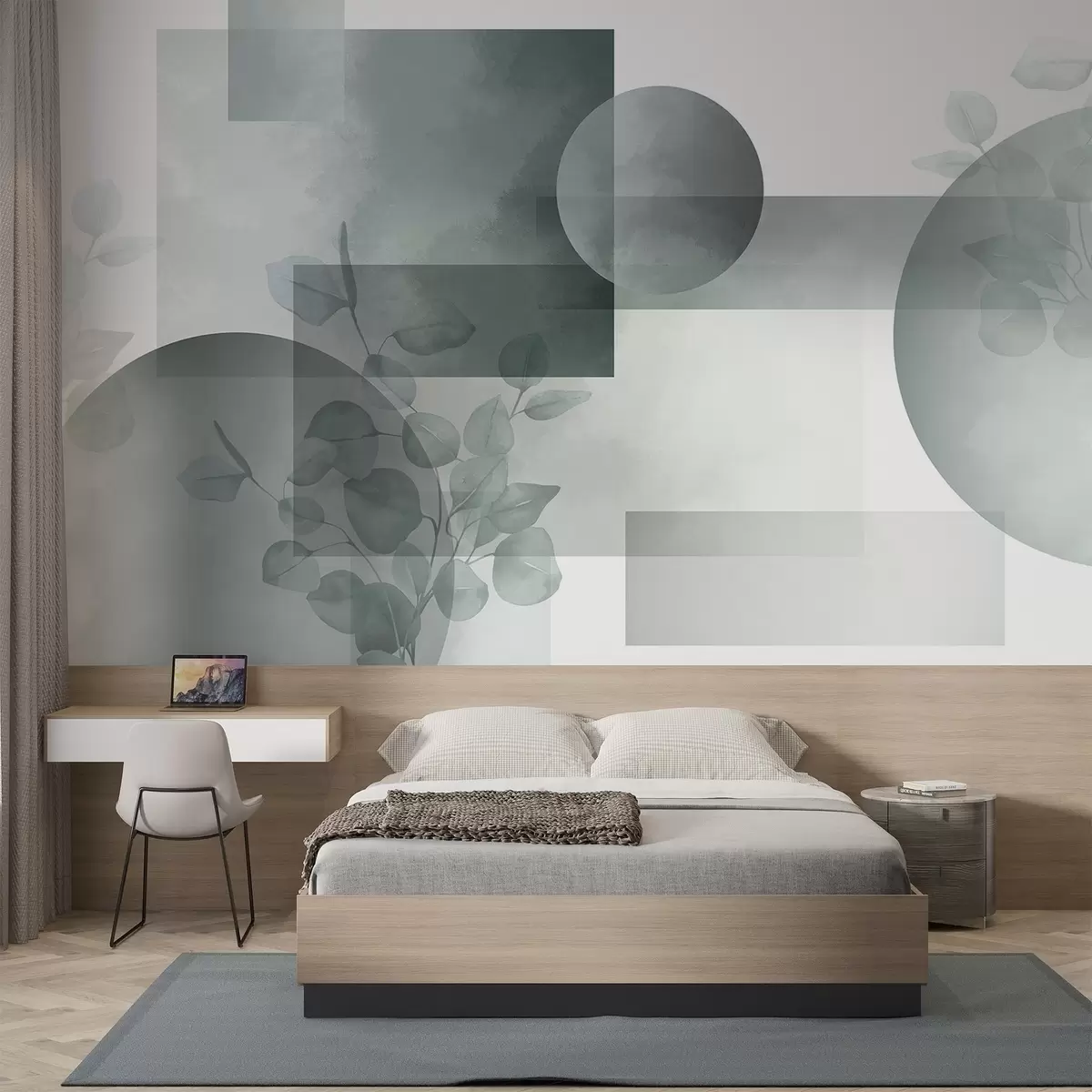 Fototapet Design geometric abstract modern minimalist cu cercuri și dreptunghiuri, frunze de eucalipt, efect de acuarelă Nr. w09110