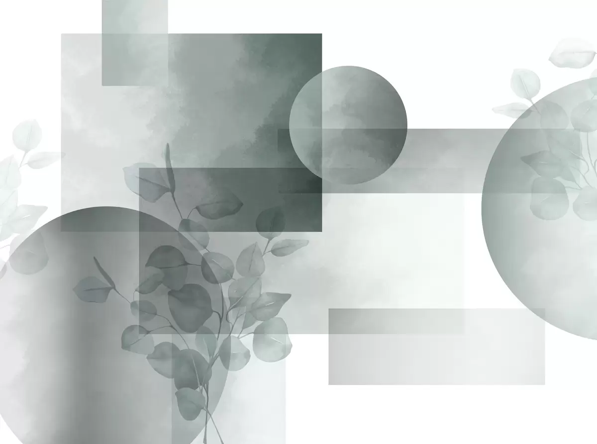 Fototapet Design geometric abstract modern minimalist cu cercuri și dreptunghiuri, frunze de eucalipt, efect de acuarelă Nr. w09110