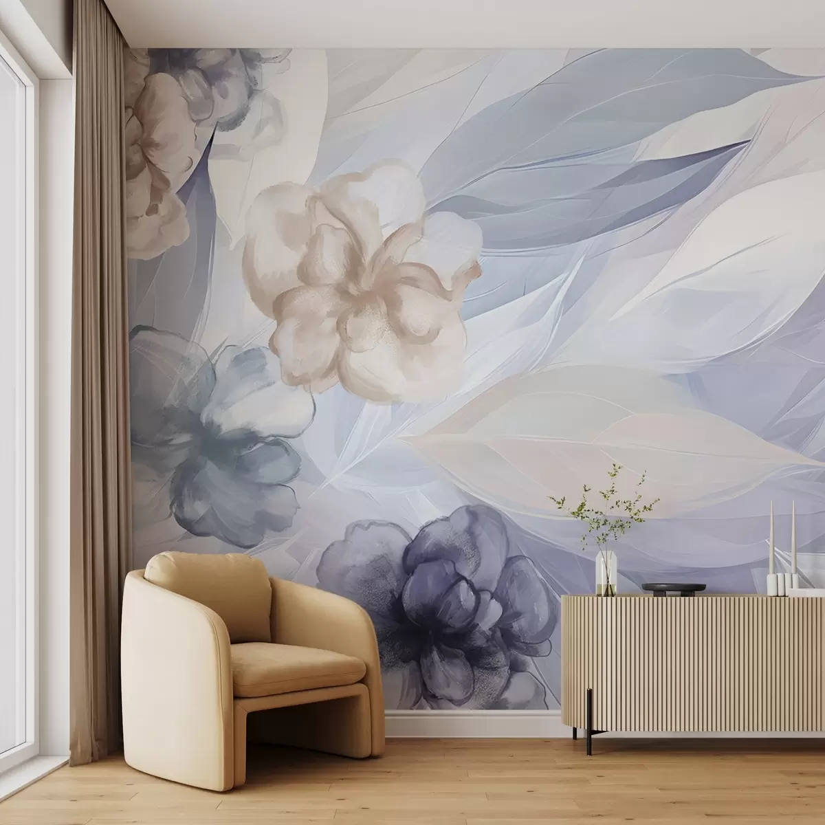 Fototapet Delicate flori și frunze în nuanțe de alb, albastru, violet și bej fundal floral , culori moi, petale delicate Nr. w09111
