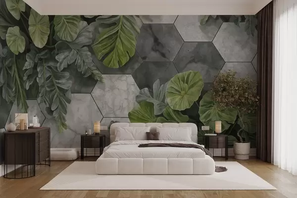 Fototapet Frunze tropicale verzi și plante pe un fundal de gresie texturate gri și alb, luxuriante frunze de design modern Nr. w09117