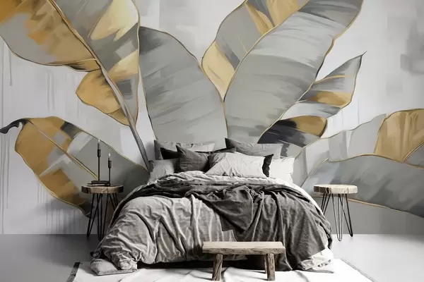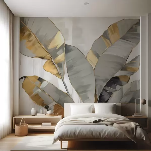 Fototapet Banana tropicală frunze texturate cu tonuri gri și galben, stil modern, fundal neutru, pictură decorativă Nr. w09118