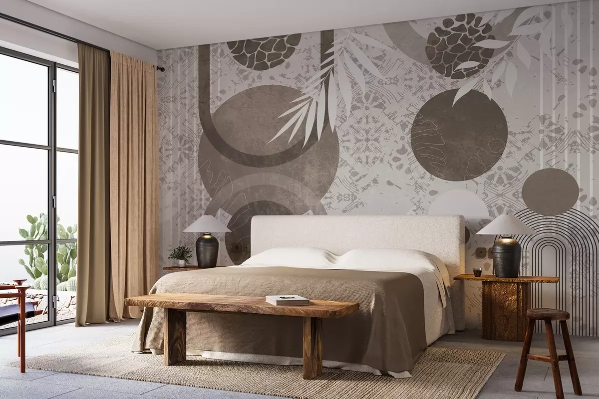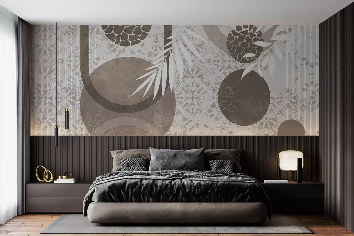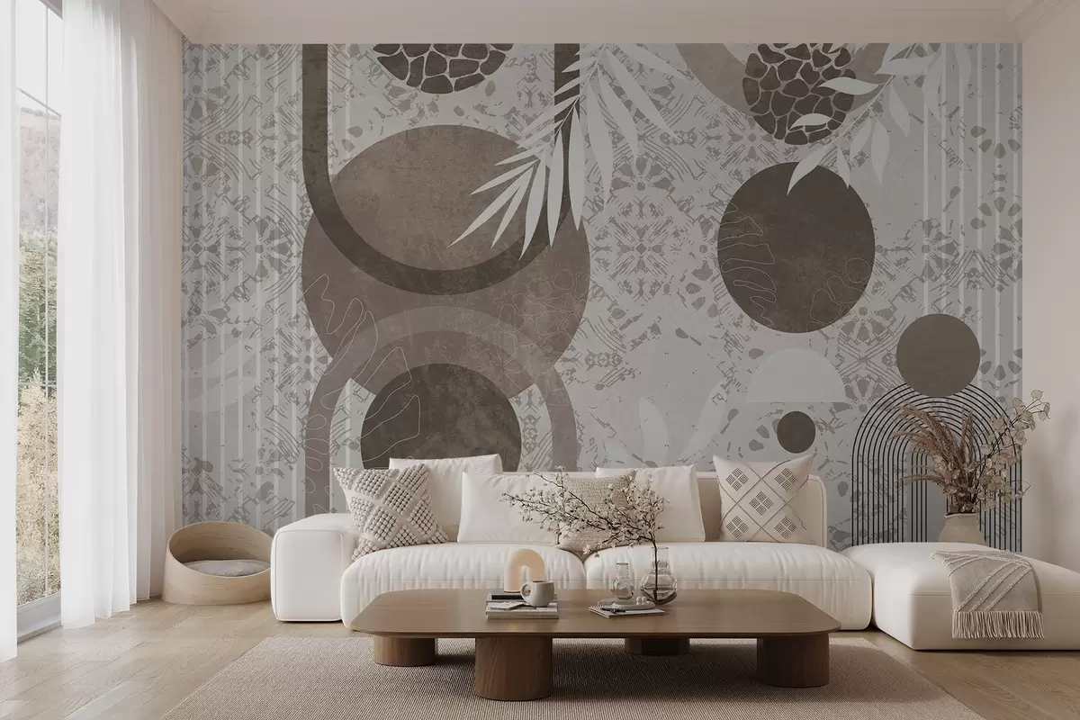 Fototapet Forme geometrice abstracte texturale în maro și alb, cercuri, arcuri și elemente botanice, design modern și minimalist Nr. w09130
