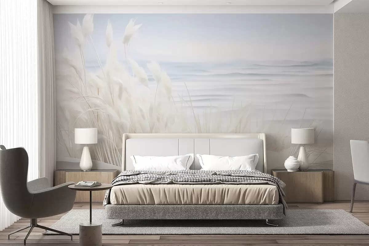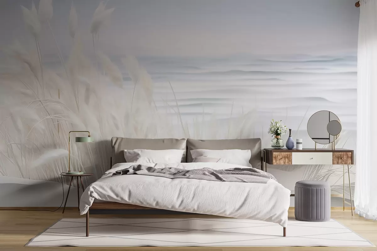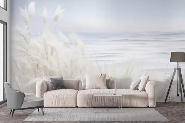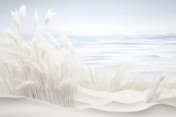 Fototapet Peisaj cu iarbă albă de pampas pe o dună de nisip, cu un ocean albastru deschis în fundal, moale, stil minimalist Nr. w09132