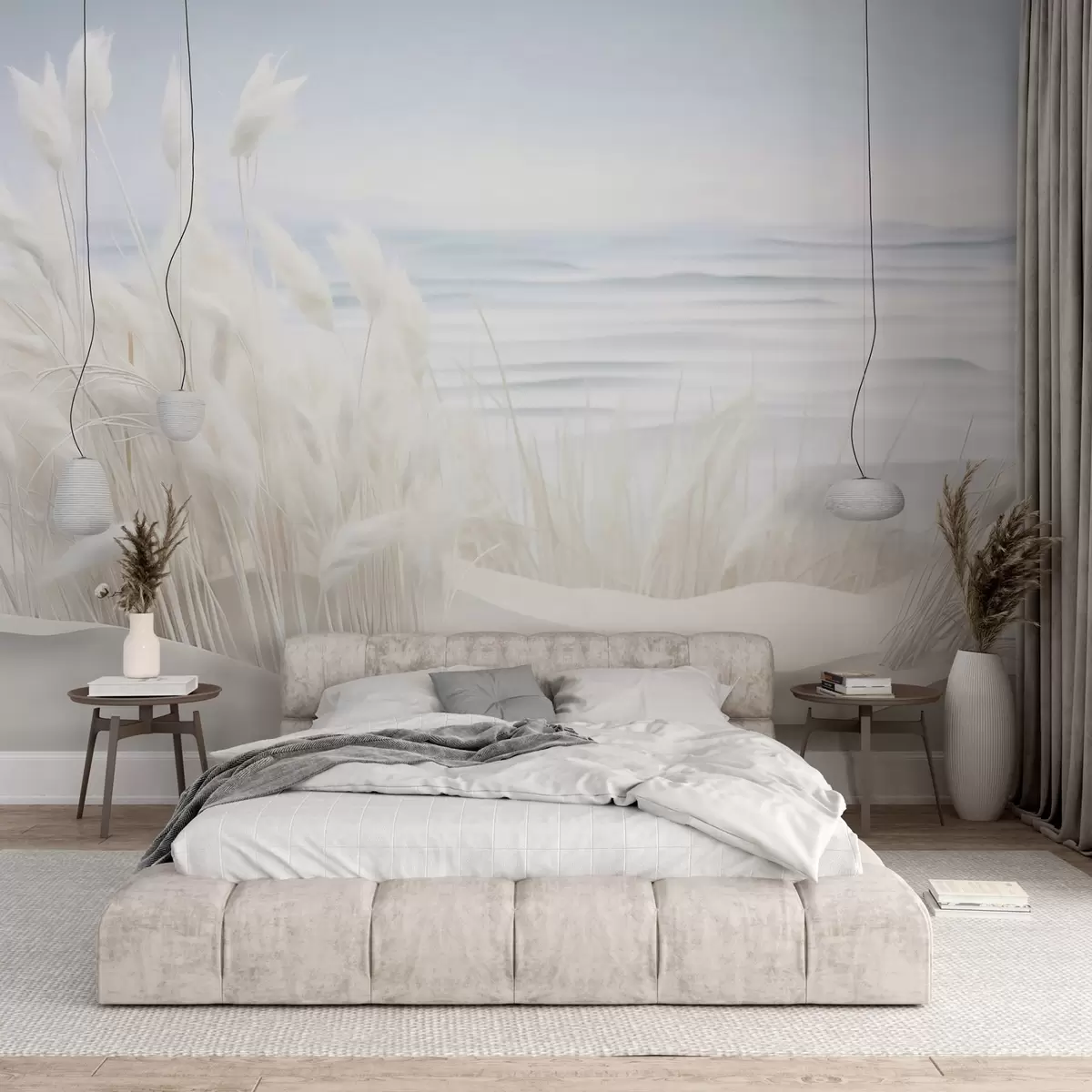 Fototapet Peisaj cu iarbă albă de pampas pe o dună de nisip, cu un ocean albastru deschis în fundal, moale, stil minimalist Nr. w09132