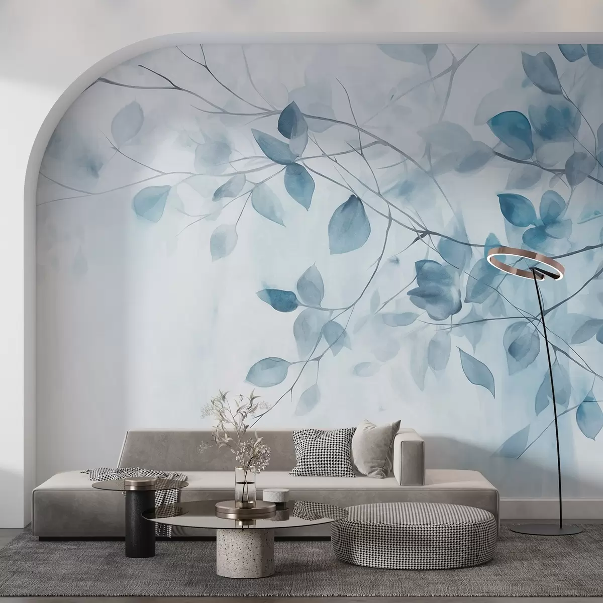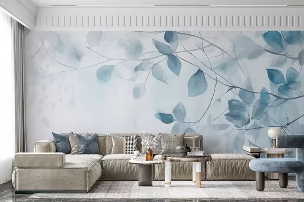 Fototapet Textural pictura acuarelă imitație de frunze albastre și ramuri, culori moi, detalii delicate pe un fundal alb Nr. w09133v1