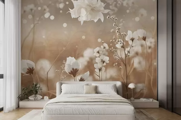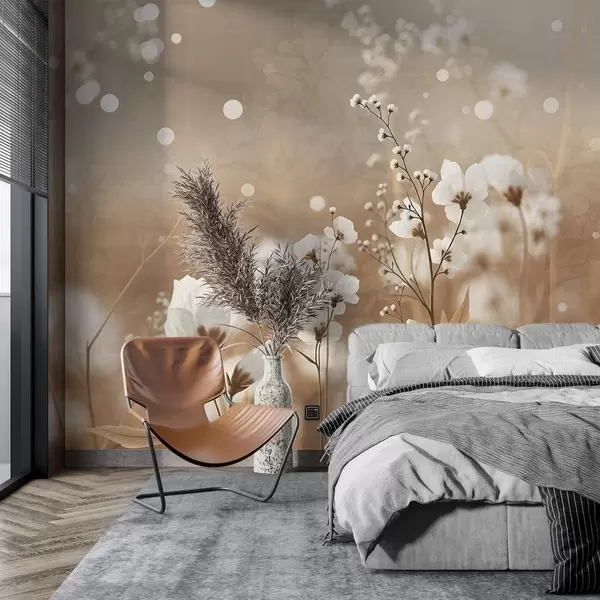 Fototapet Flori albe cu tulpini și frunze maro într-un câmp, efect bokeh, paletă de culori calde, operă de artă elegantă inspirată din natură Nr. w09135