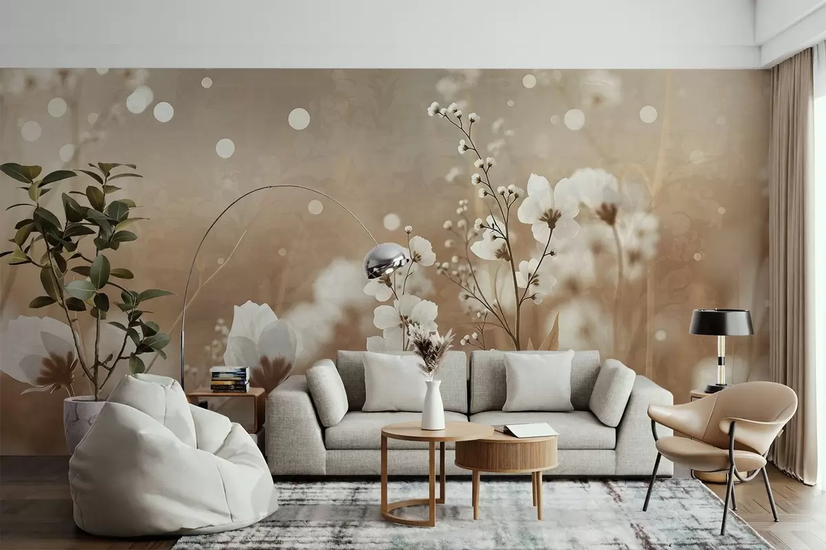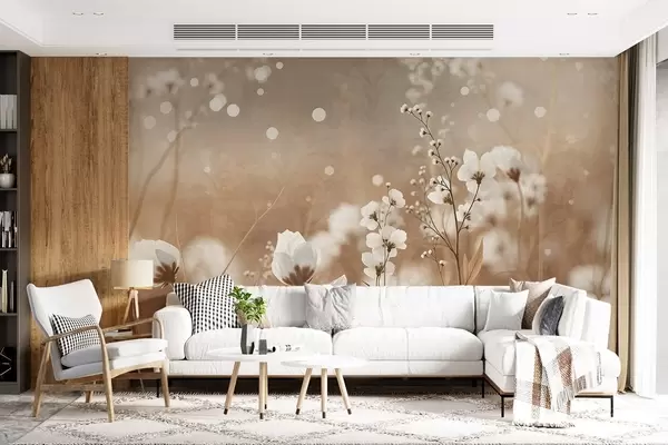 Fototapet Flori albe cu tulpini și frunze maro într-un câmp, efect bokeh, paletă de culori calde, operă de artă elegantă inspirată din natură Nr. w09135