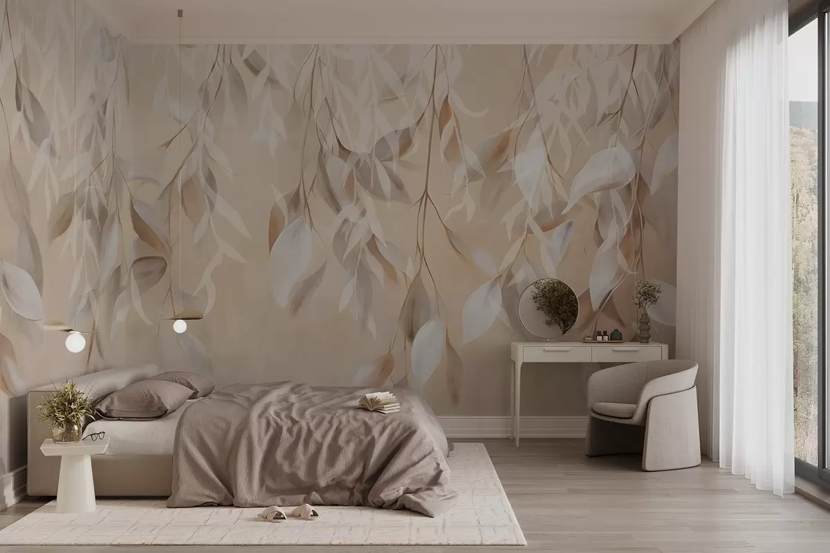 Fototapet Agățat frunze texturate alb și bej cu o paletă de culori moi, piersică, gri și alb fundal delicat Nr. w09136