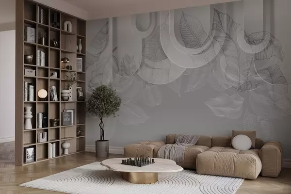 Fototapet Fundal abstract cu arcuri gri și frunze tropicale albe, design minimalist, elegant și modern, paletă de culori neutre Nr. w09138
