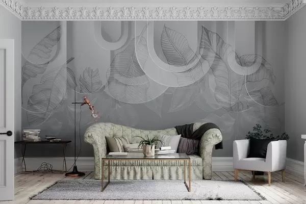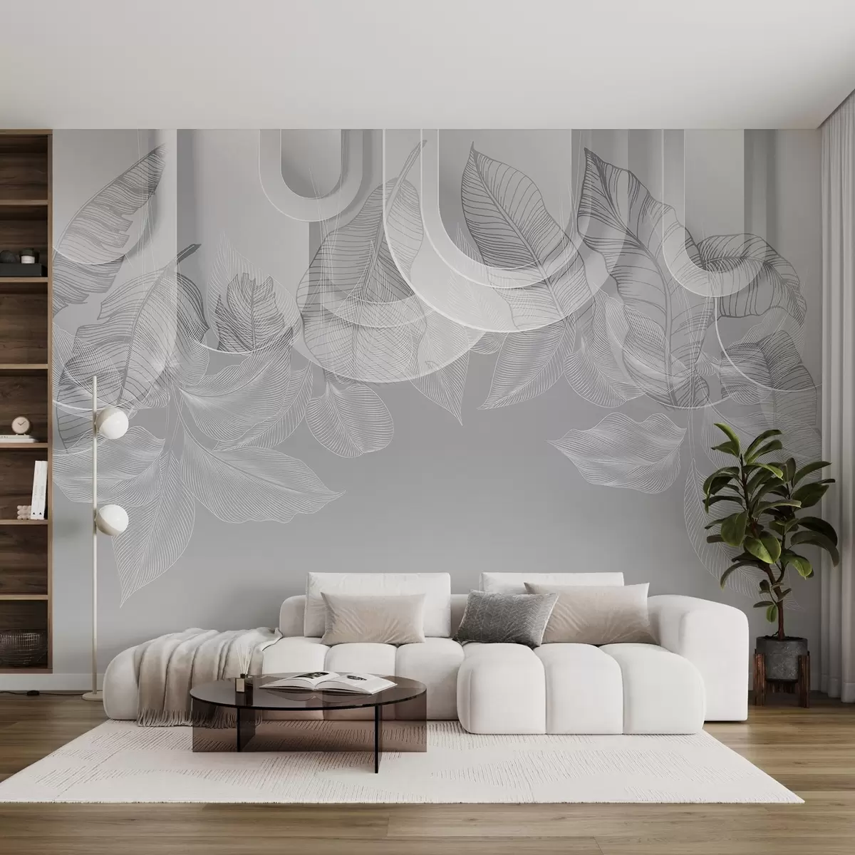 fototapet Fundal abstract cu arcuri gri și frunze tropicale albe, design minimalist, elegant și modern, paletă de culori neutre w09138