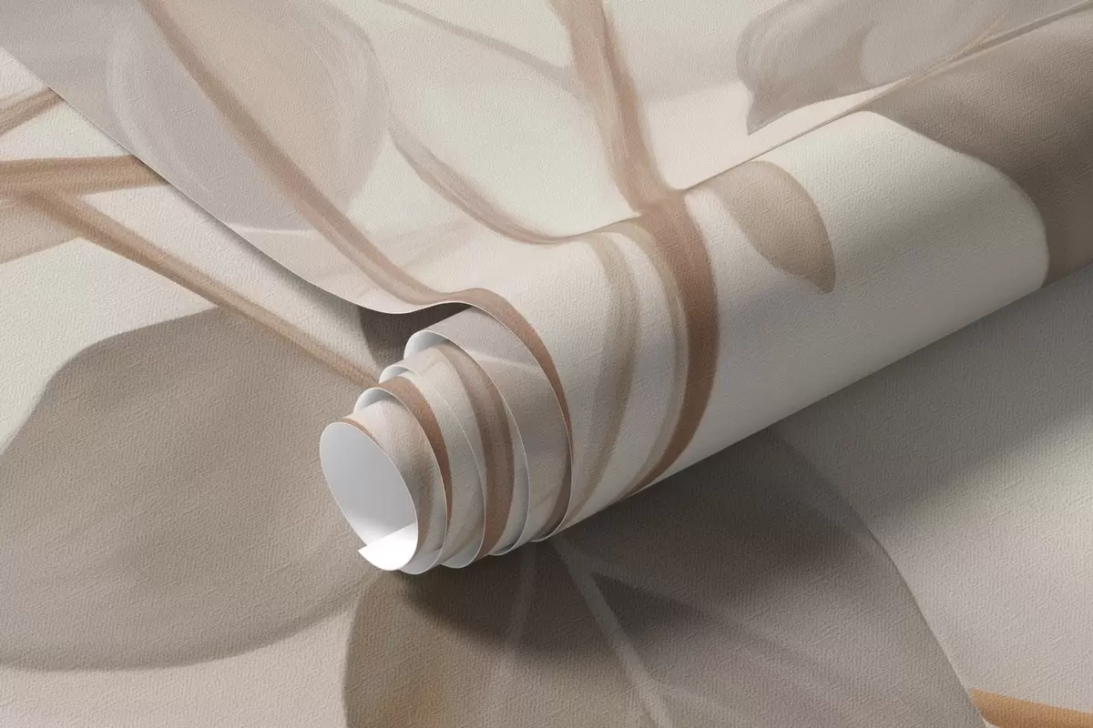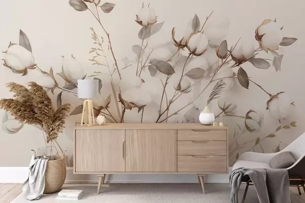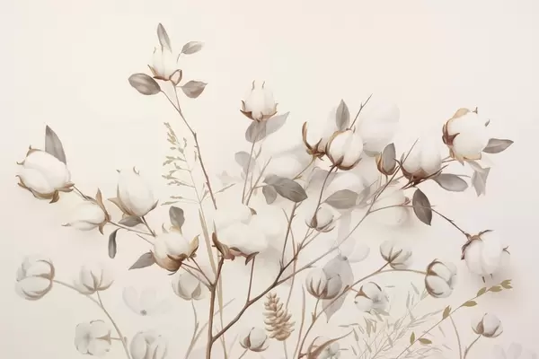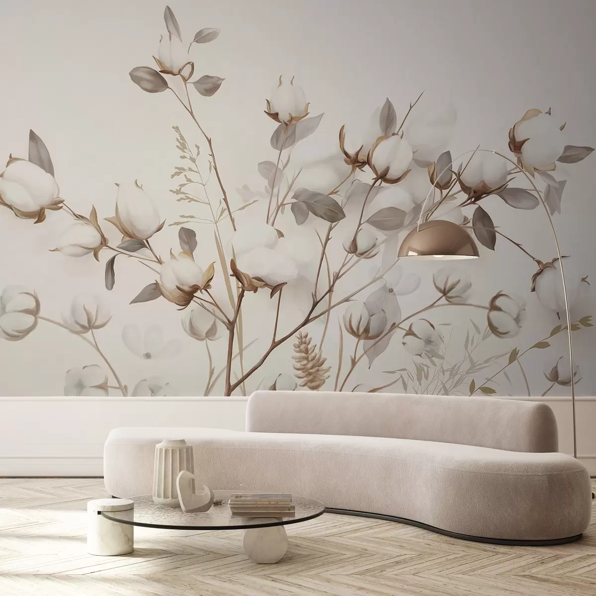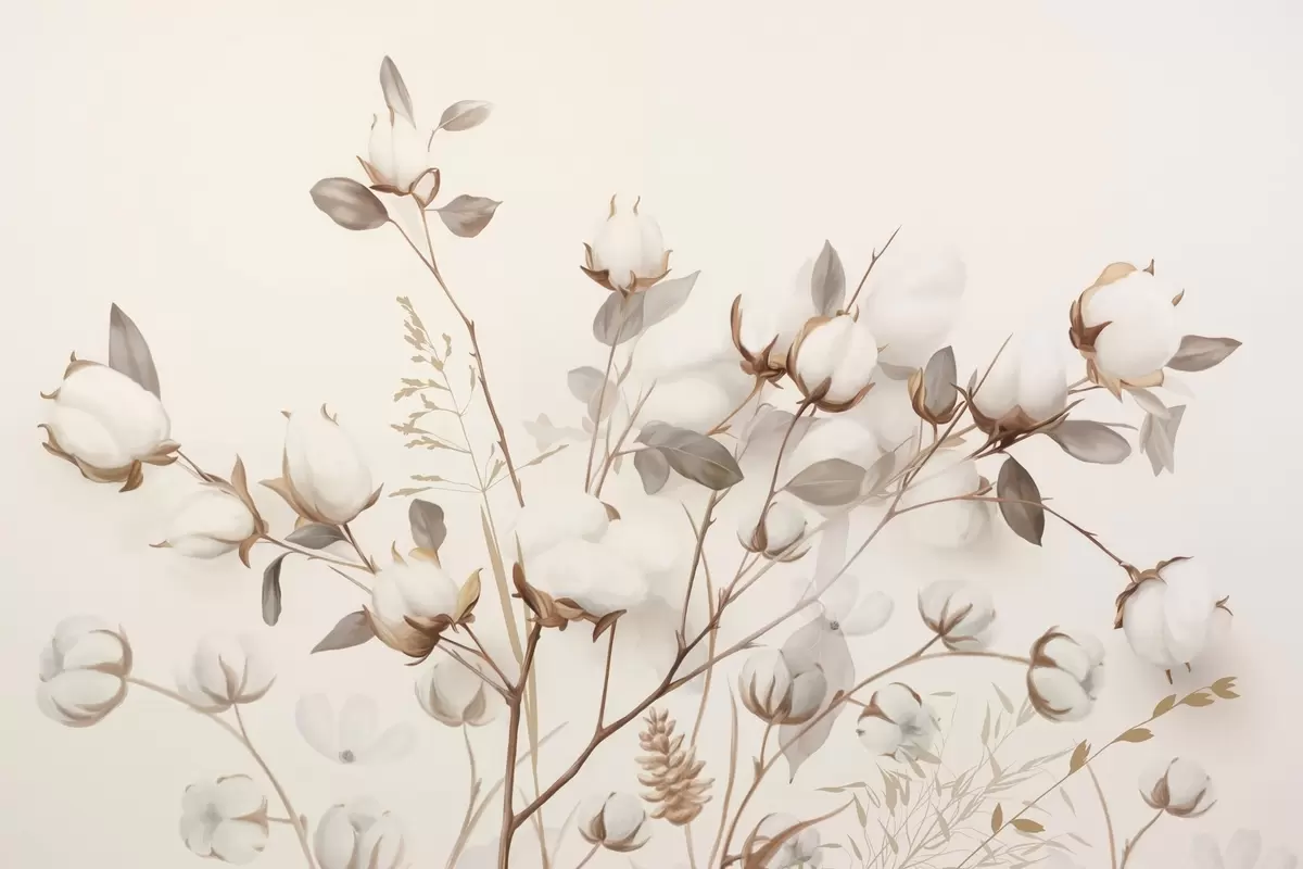 Fototapet Flori de bumbac cu tulpini și frunze într-o paletă de culori maro deschis, fundal bej, moale și delicat, stil acuarelă Nr. w09141