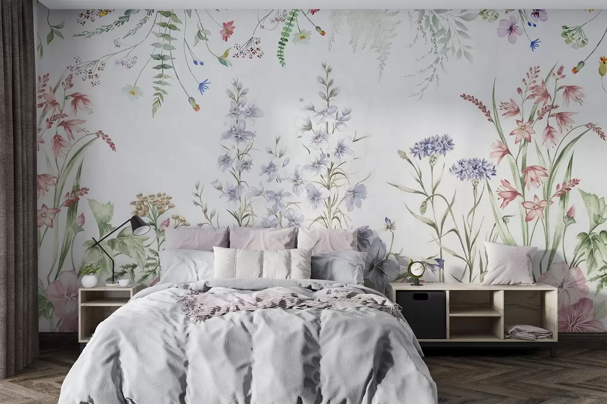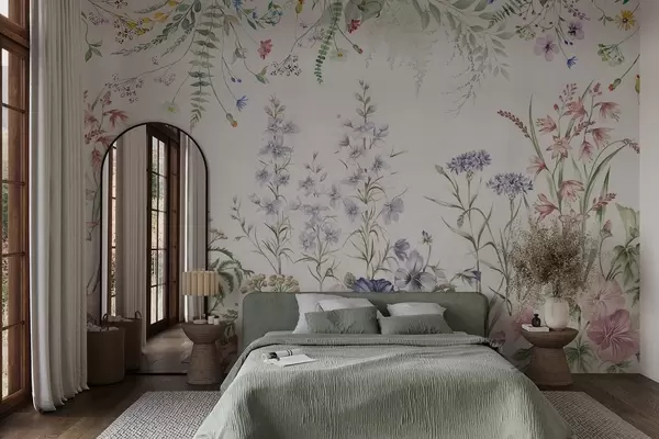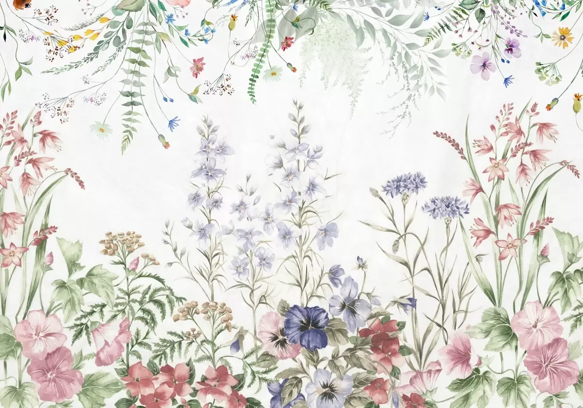 Fototapet Aranjament floral textural cu flori colorate și frunze verzi, ilustrație botanică, culori pastelate moi, stil vintage Nr. w09143
