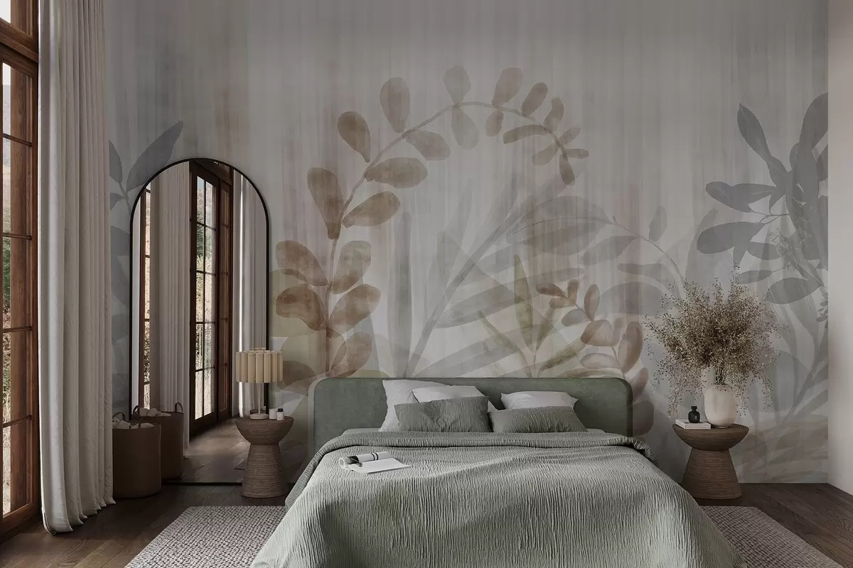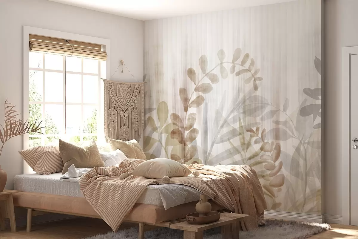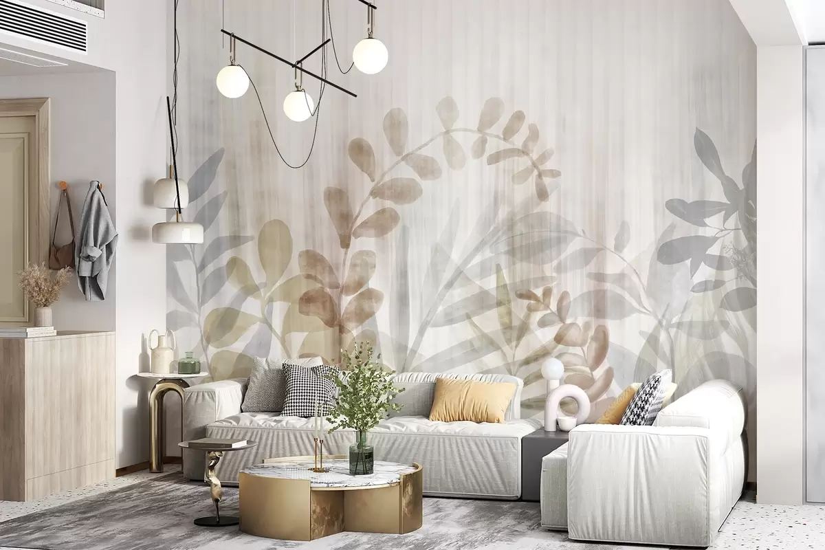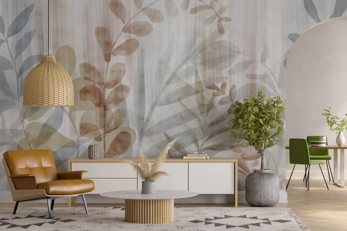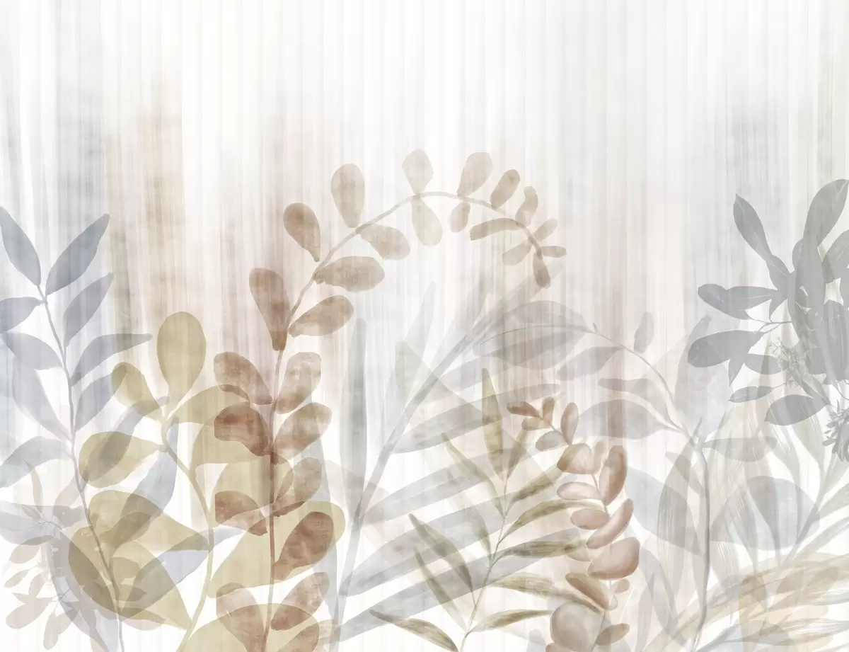 Fototapet Pictura acuarelă imitație de plante cu frunze multicolore mute, fundal deschis cu linii verticale, ilustrare botanică Nr. w09146