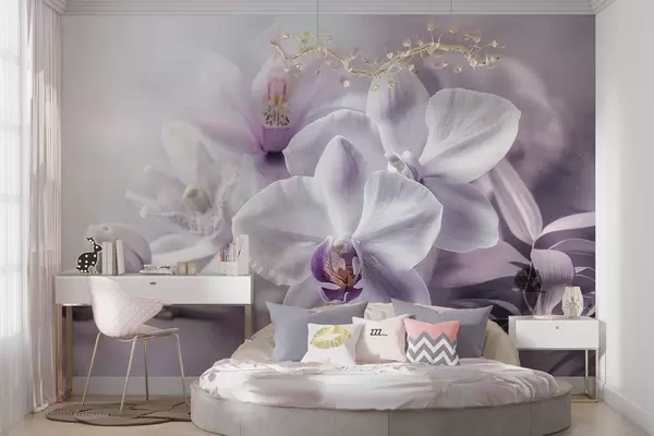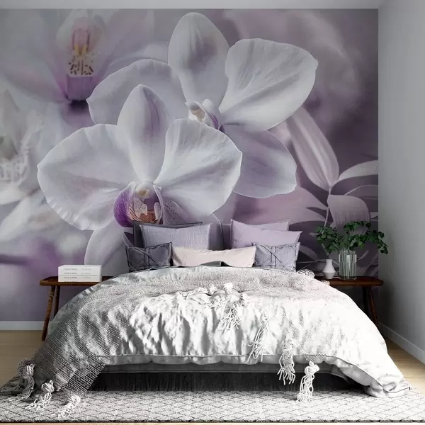 Fototapet Flori delicate de orhidee albe și liliachii, iluminare blândă și un fundal cu textură neclară Nr. w09155