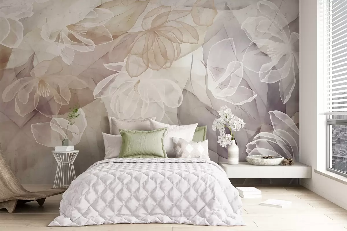 Fototapet Flori și frunze cu petale transparente în nuanțe de alb, bej și violet, moi și delicate Nr. w09158