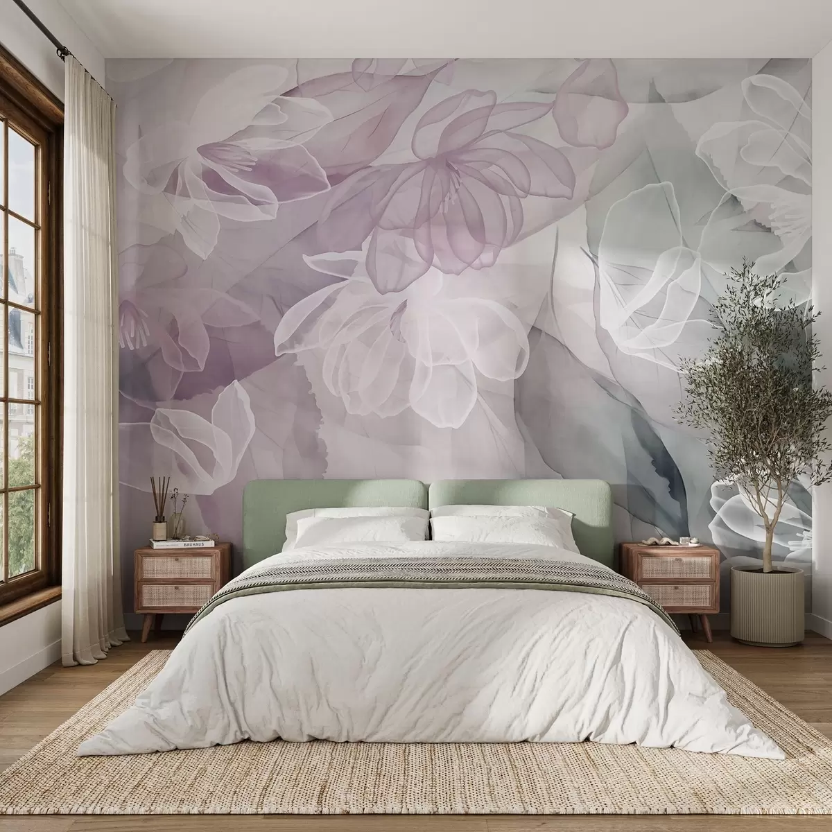 Fototapet Flori și frunze cu petale transparente în nuanțe de alb, roz și verde, moi și delicate Nr. w09158v1