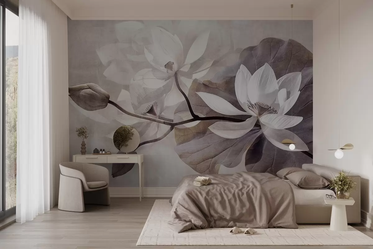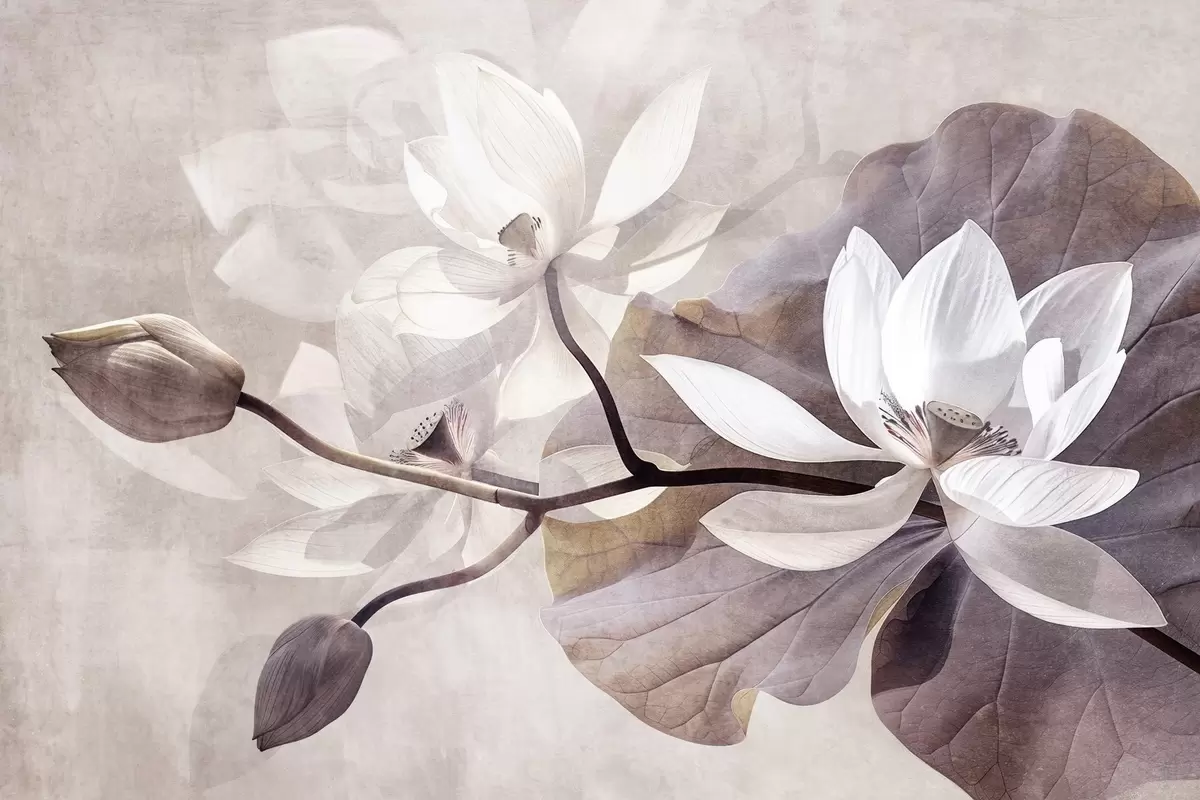 Fototapet Grainy texturate muted flori de lotus delicate cu frunze și tulpini într-o paletă de culori moi, bej Nr. w09159