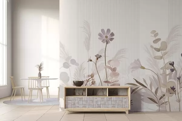 Fototapet Flori în culori pastelate, frunze maro deschis, fundal alb cu linii verticale, elegant și minimalist Nr. w09161