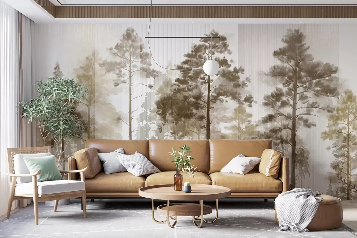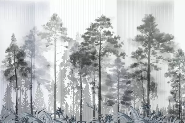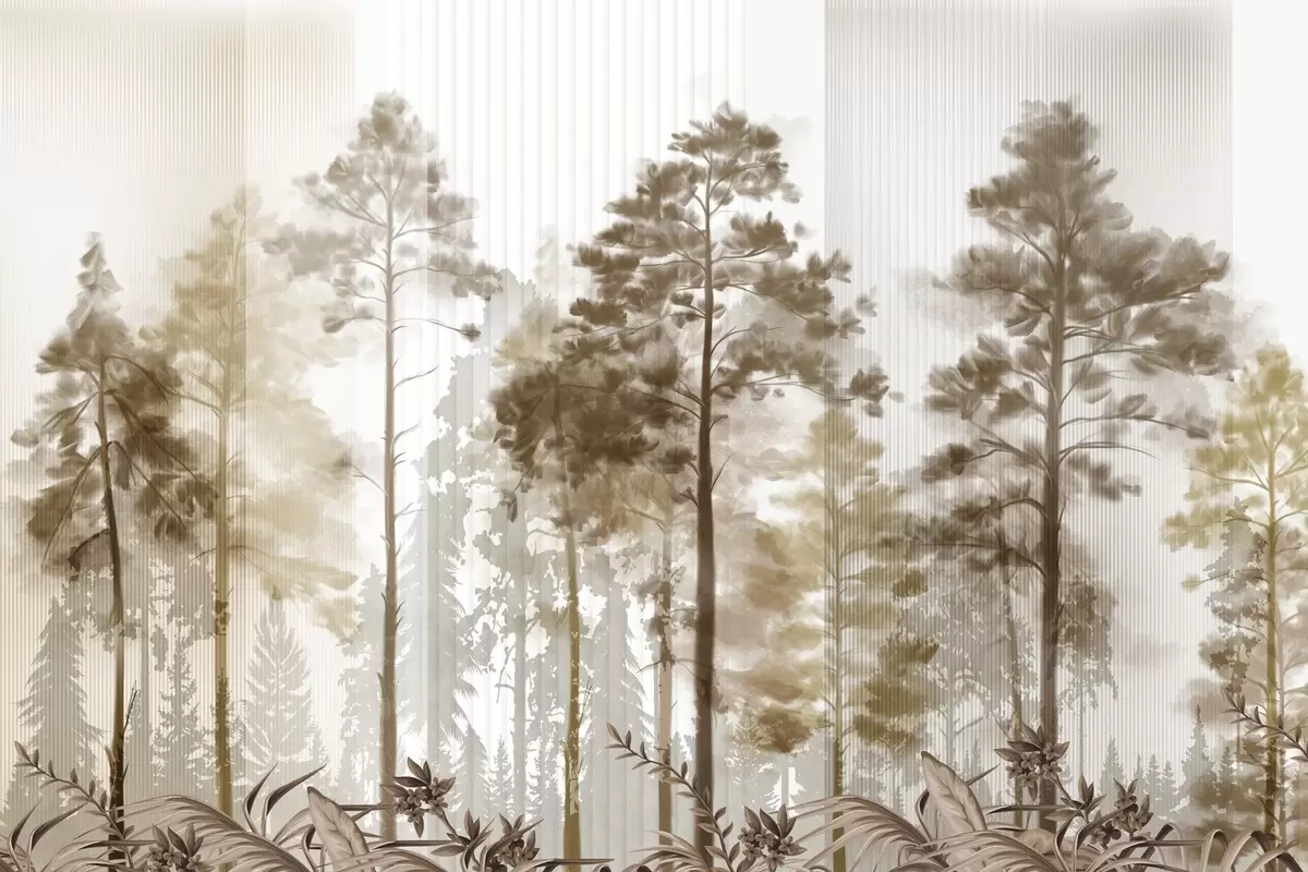 Fototapet O pădure densă cu pini înalți, frunze bej luxuriante, o atmosferă cețoasă cu texturi de linii verticale Nr. w09163v1
