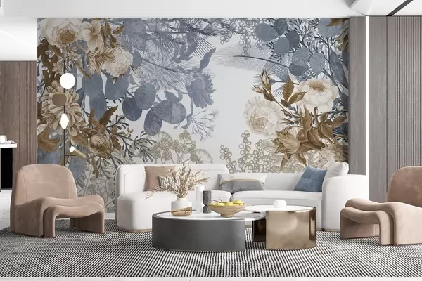Fototapet Aranjament floral vintage cu trandafiri, eucalipt și mimosa în nuanțe de albastru și maro Nr. w09164