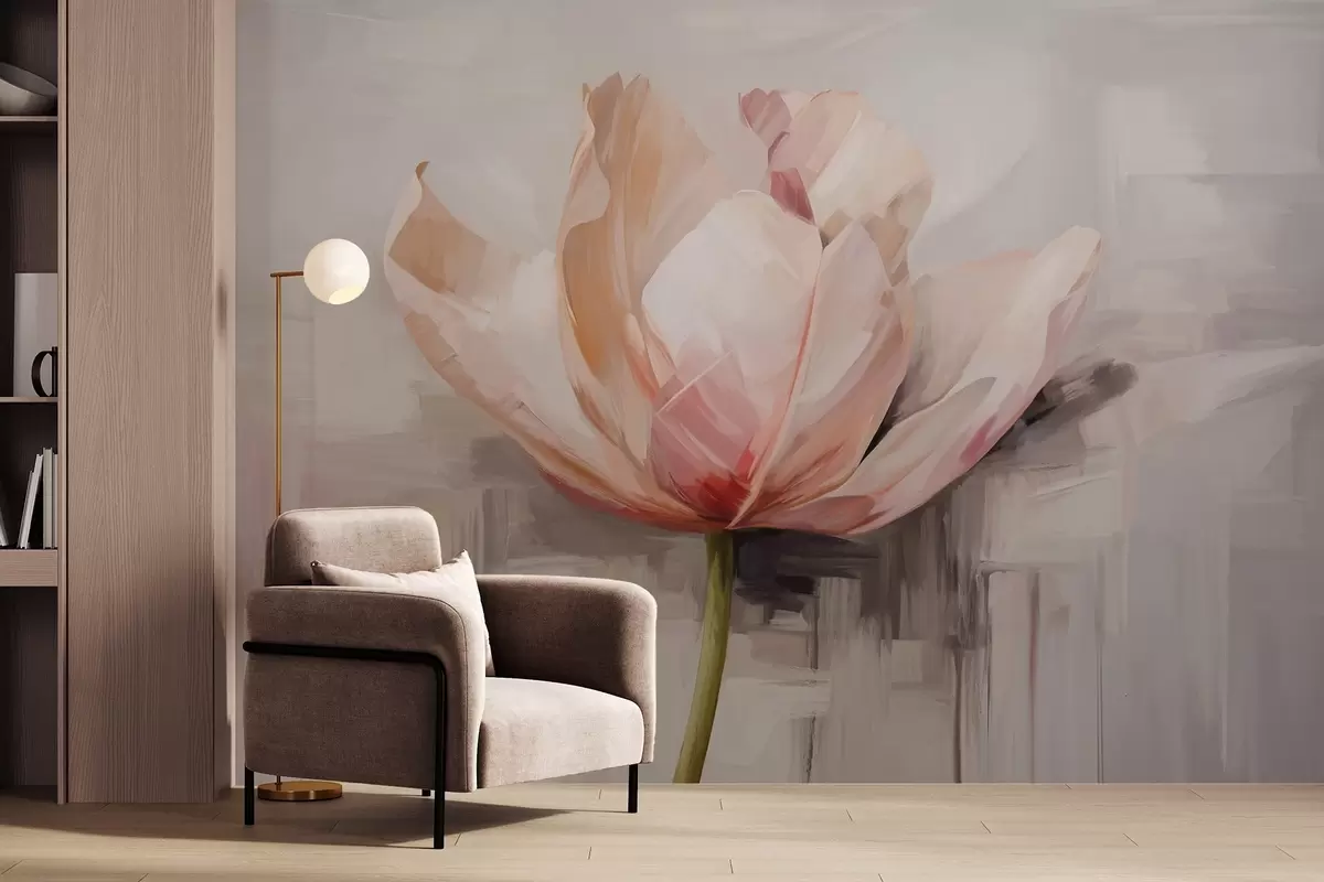 Fototapet Lalea roz, imitație de pictură în ulei cu lovituri de perie moi, fundal abstract cu nuanțe pastelate de gri și bej Nr. w09187