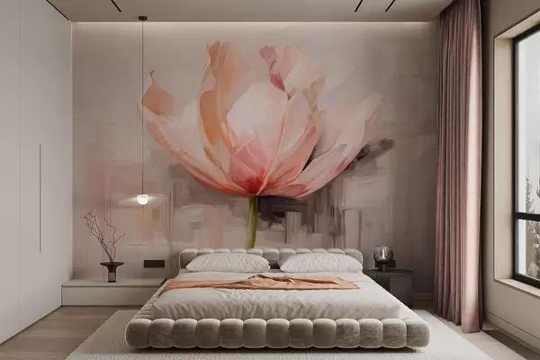 Fototapet Lalea roz, imitație de pictură în ulei cu lovituri de perie moi, fundal abstract cu nuanțe pastelate de gri și bej Nr. w09187