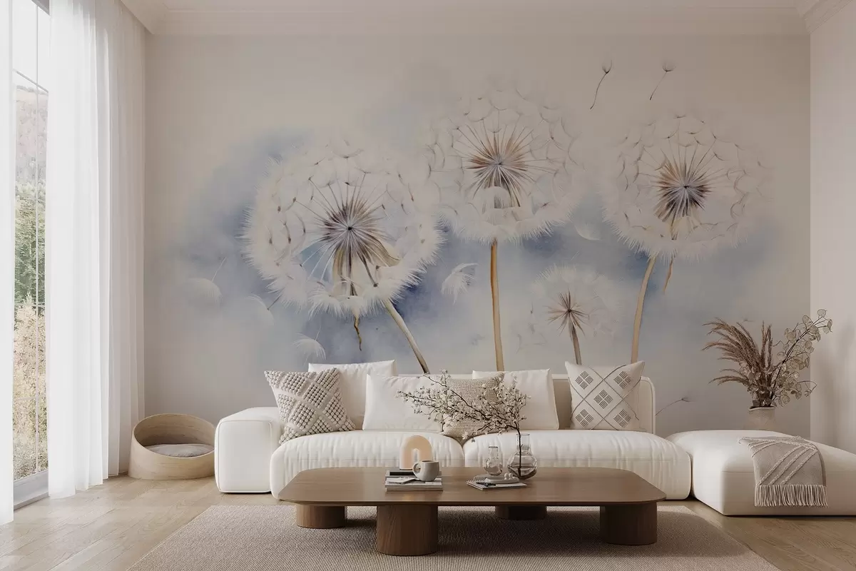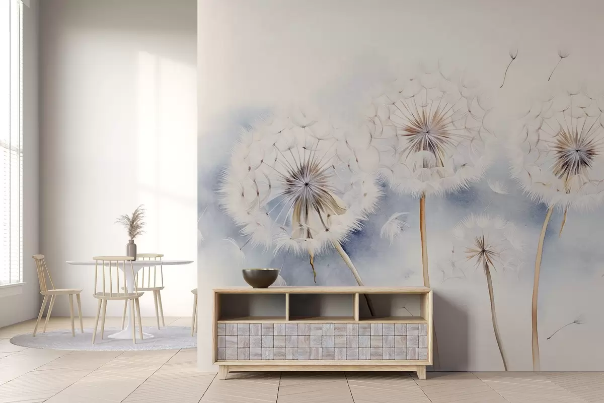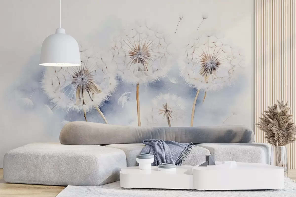 Fototapet Păpădii texturate cu semințe plutind în aer, fundal albastru deschis și alb, stil de desen delicat și moale Nr. w09190
