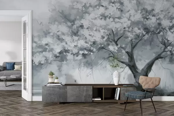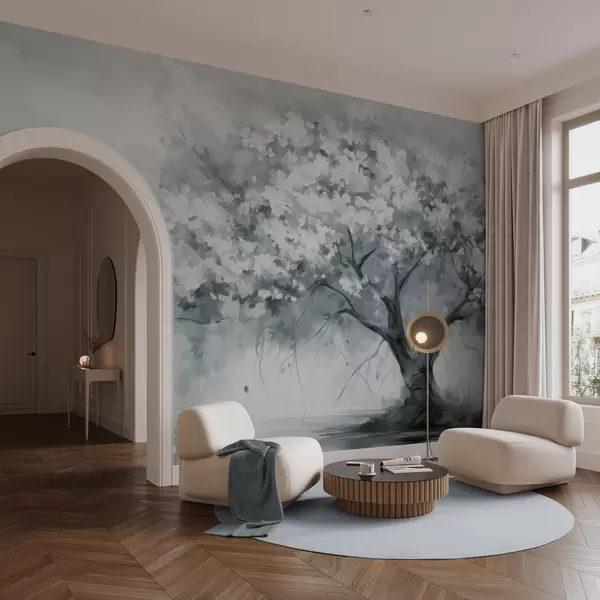 Fototapet Copac cu flori albastre abstracte în plină înflorire, lângă un râu, tușe de pensulă cu textură moale și culori pastelate Nr. w09193v2