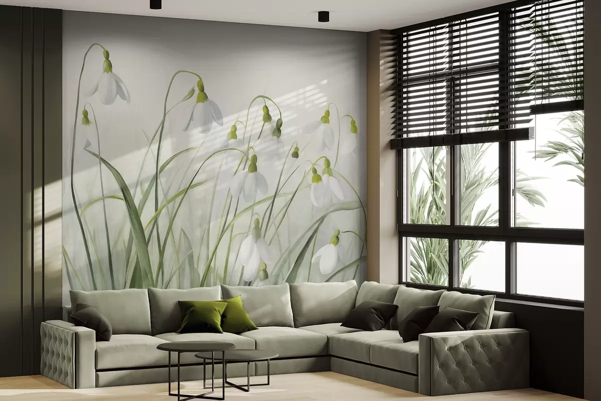 Fototapet Flori de ninsoare cu tulpini și frunze verzi texturate, acuarelă stil primăvară, tușe delicate Nr. w09195