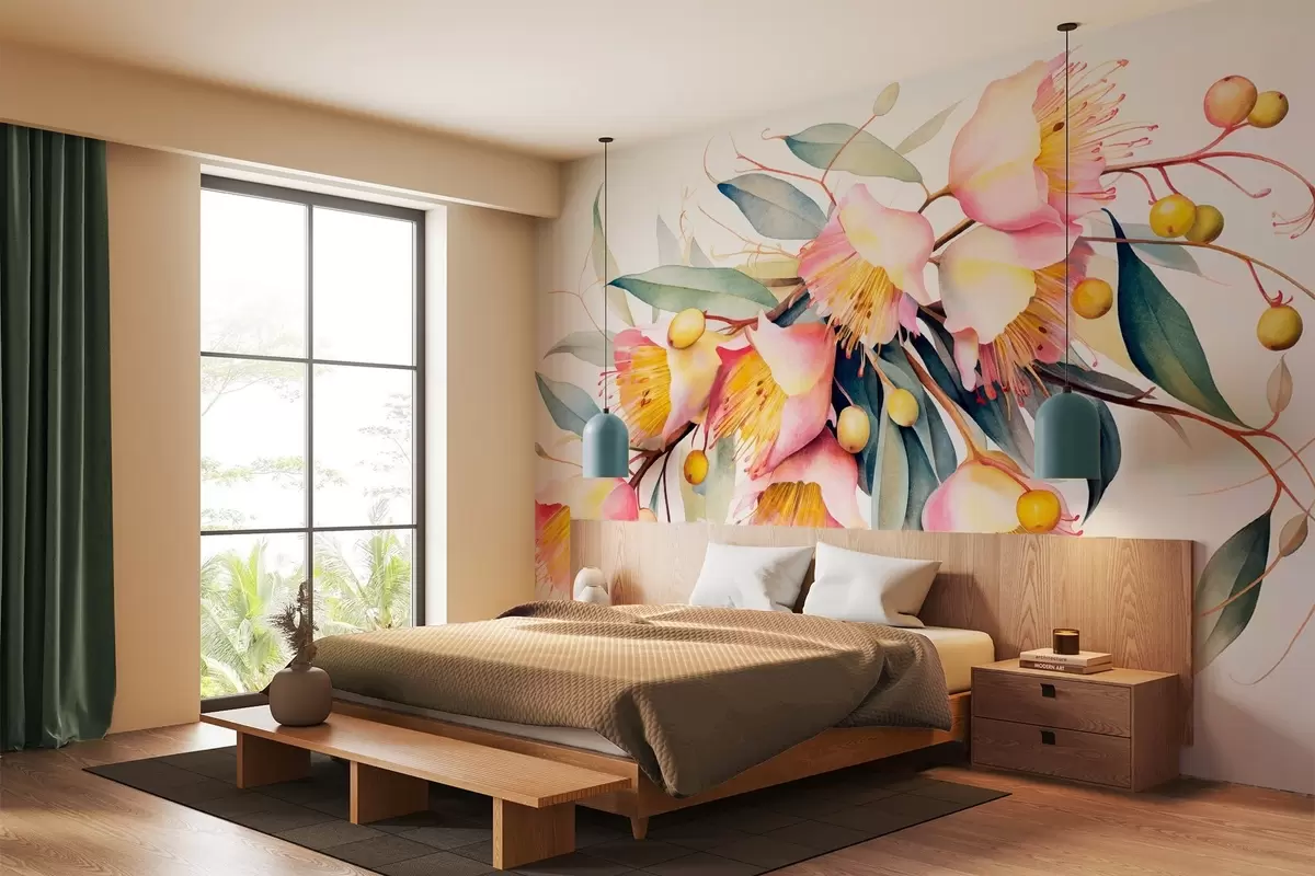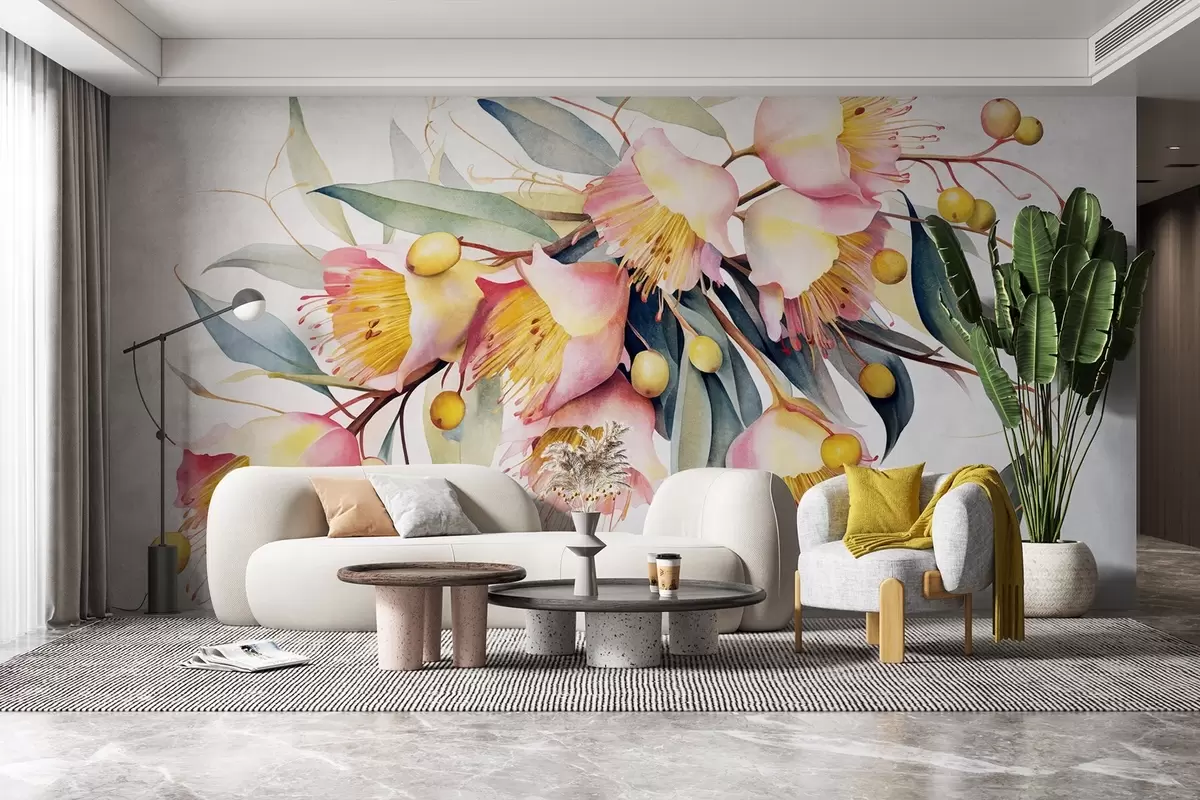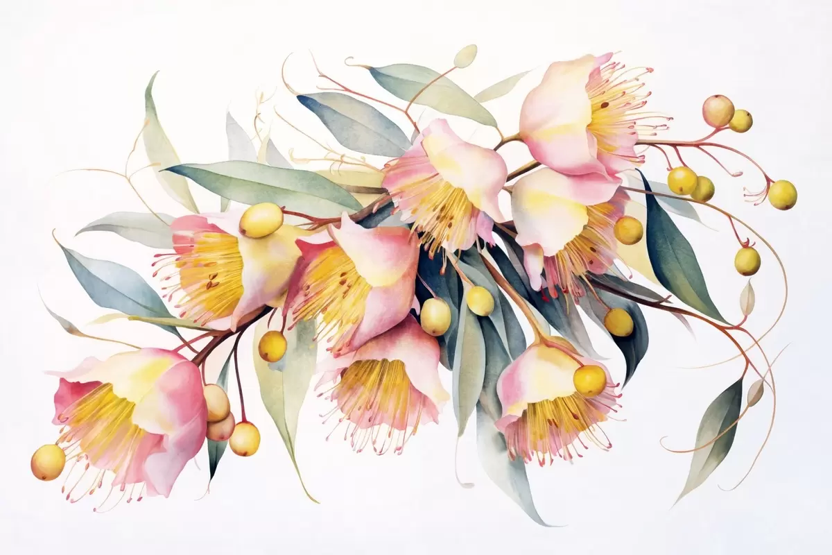 Fototapet Flori de eucalipt cu frunze verzi, stil acuarelă, moale și texturat, fundal ușor, design botanic floral Nr. w09202