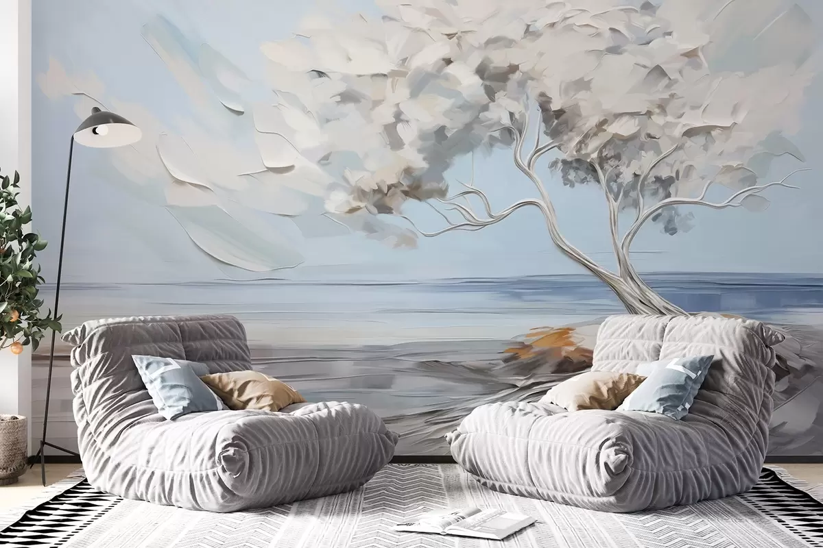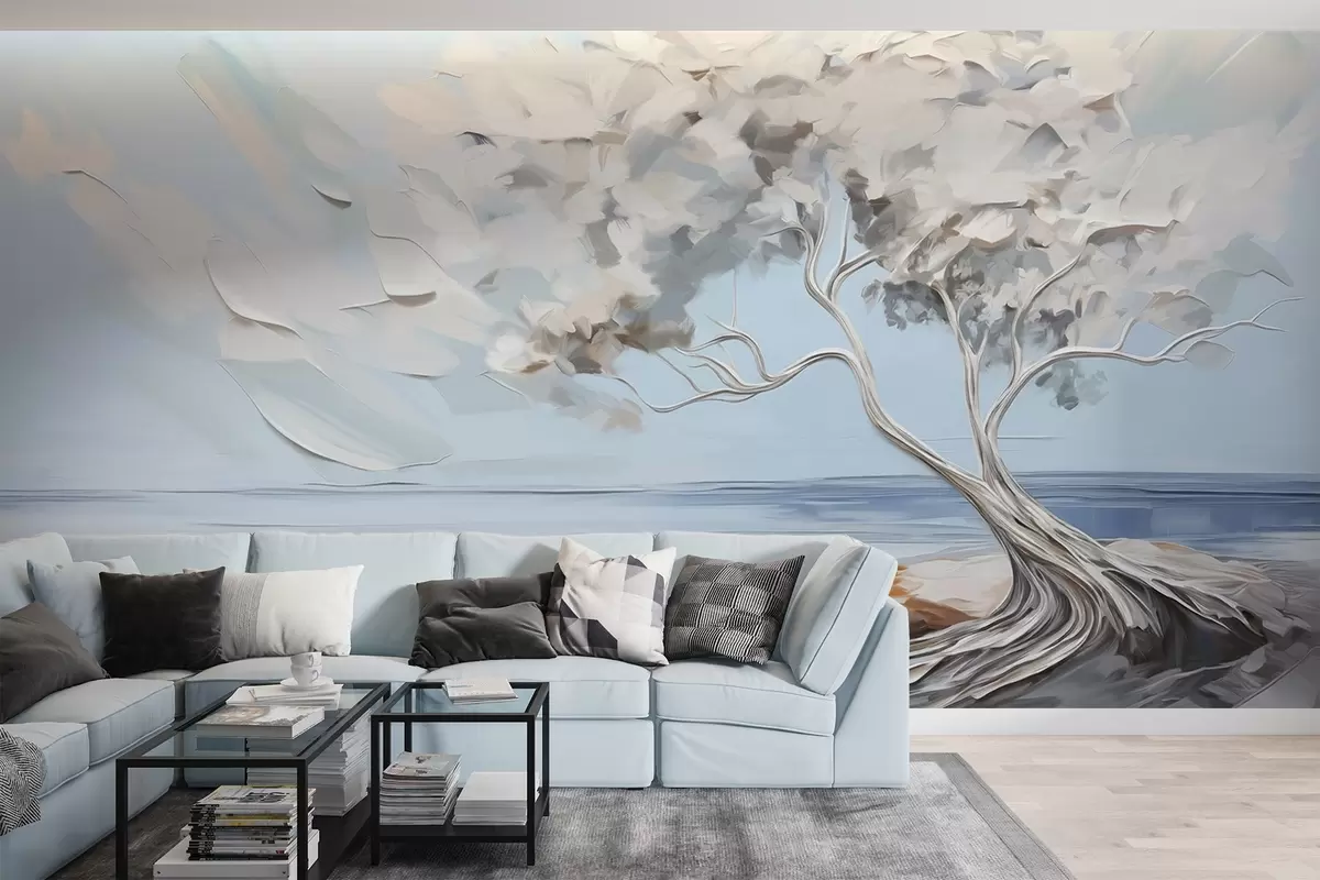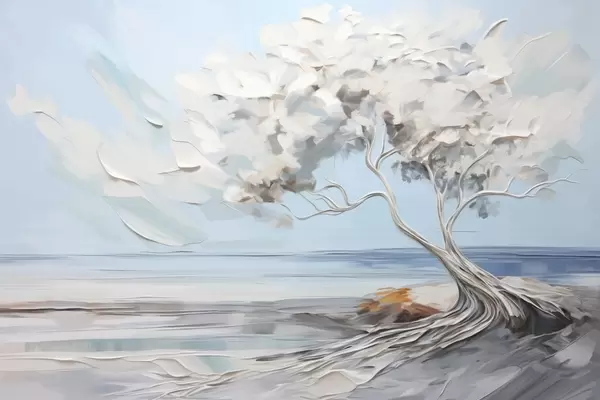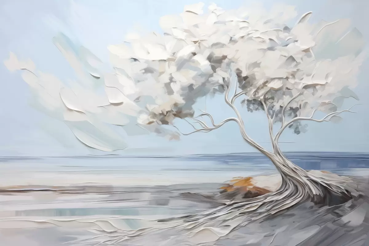 Fototapet Un copac alb cu frunze groase și texturate pe o plajă de nisip, peisaj cu un cer albastru deschis Nr. w09205