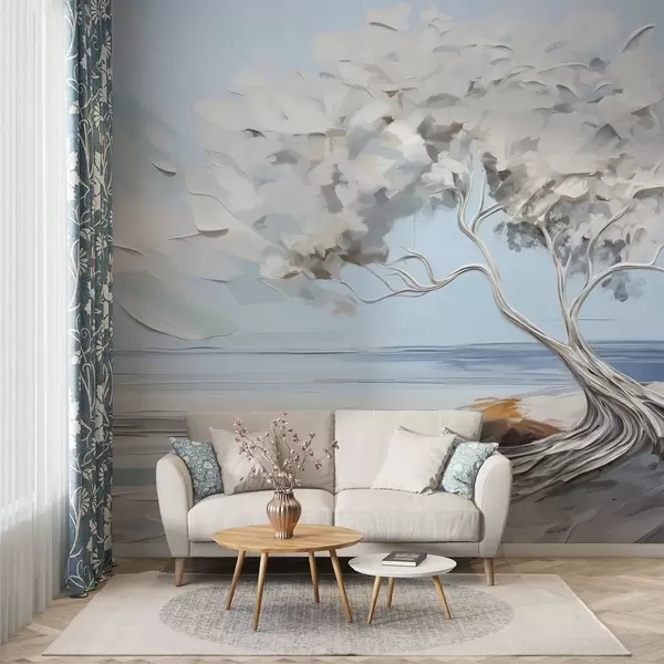 Fototapet Un copac alb cu frunze groase și texturate pe o plajă de nisip, peisaj cu un cer albastru deschis Nr. w09205