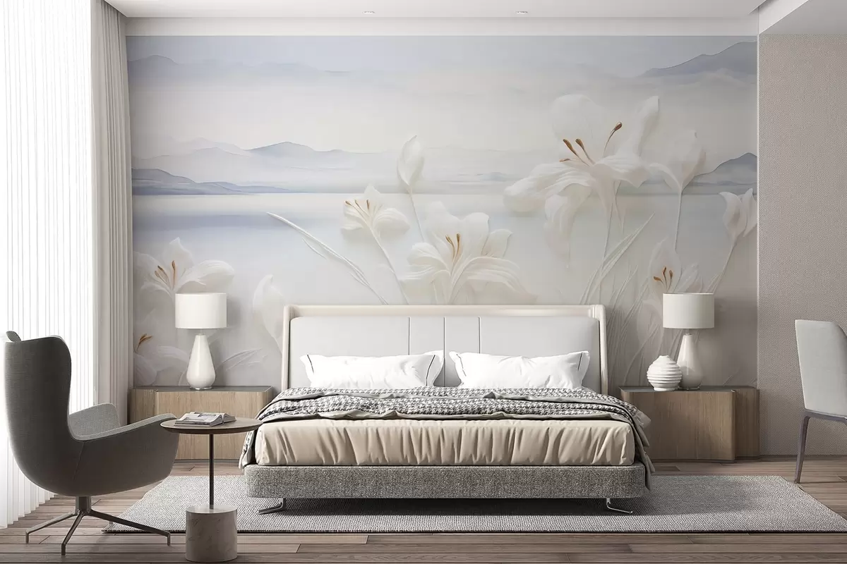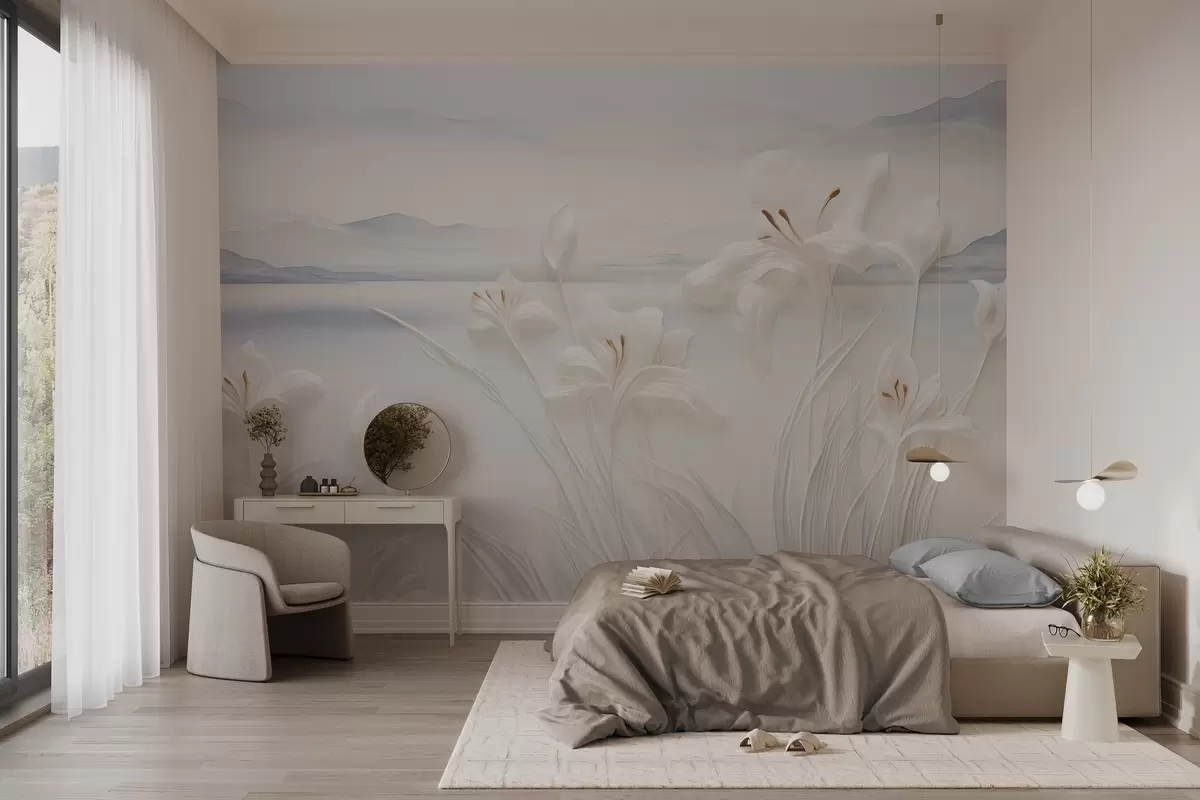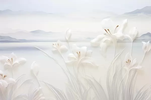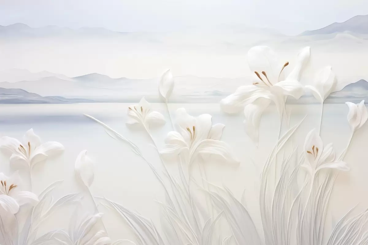Fototapet Crini albi cu tulpini lungi și frunze, munți și lac în fundal, compoziție peisagistică minimalistă Nr. w09206