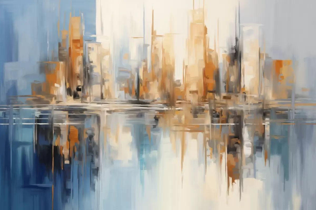 Fototapet Peisaj urban abstract texturat cu clădiri înalte în nuanțe de portocaliu, albastru și alb, reflectate în apă Nr. w09207