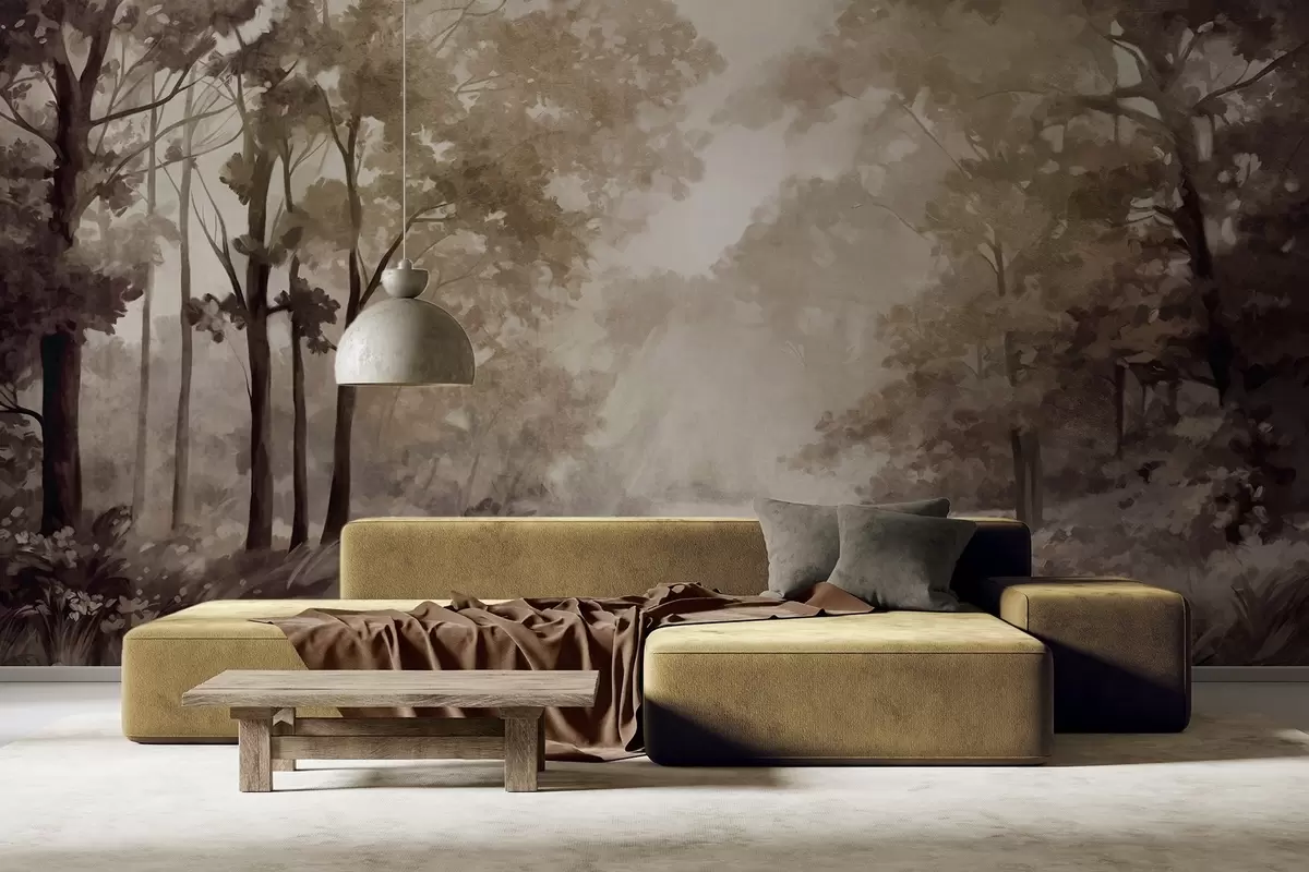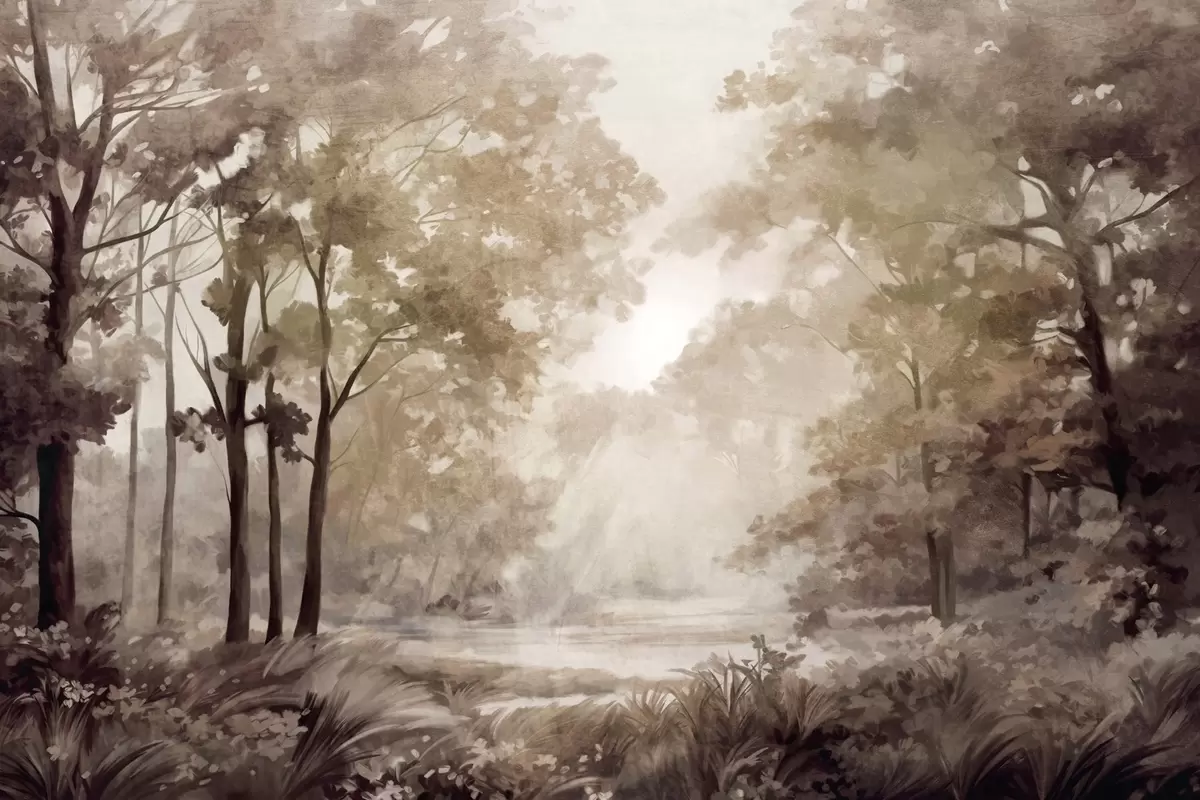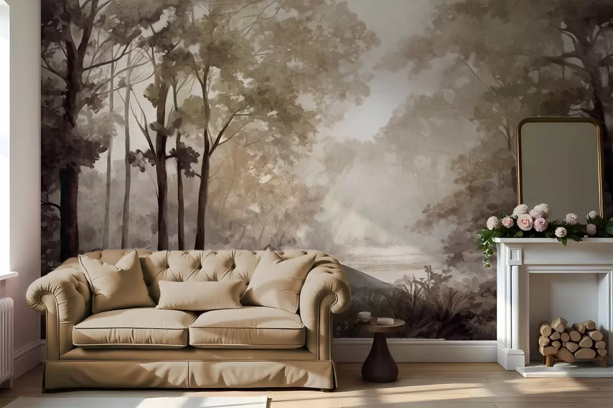 Fototapet Peisaj forestier texturat, copaci cu frunze bej și maro, paletă de culori pastelate Nr. w09210